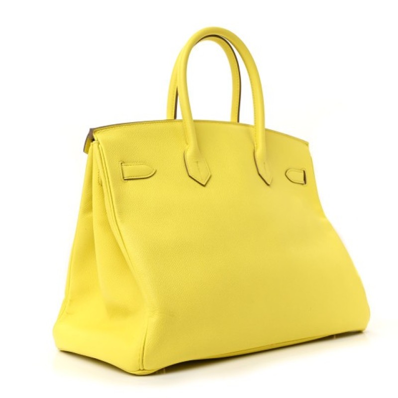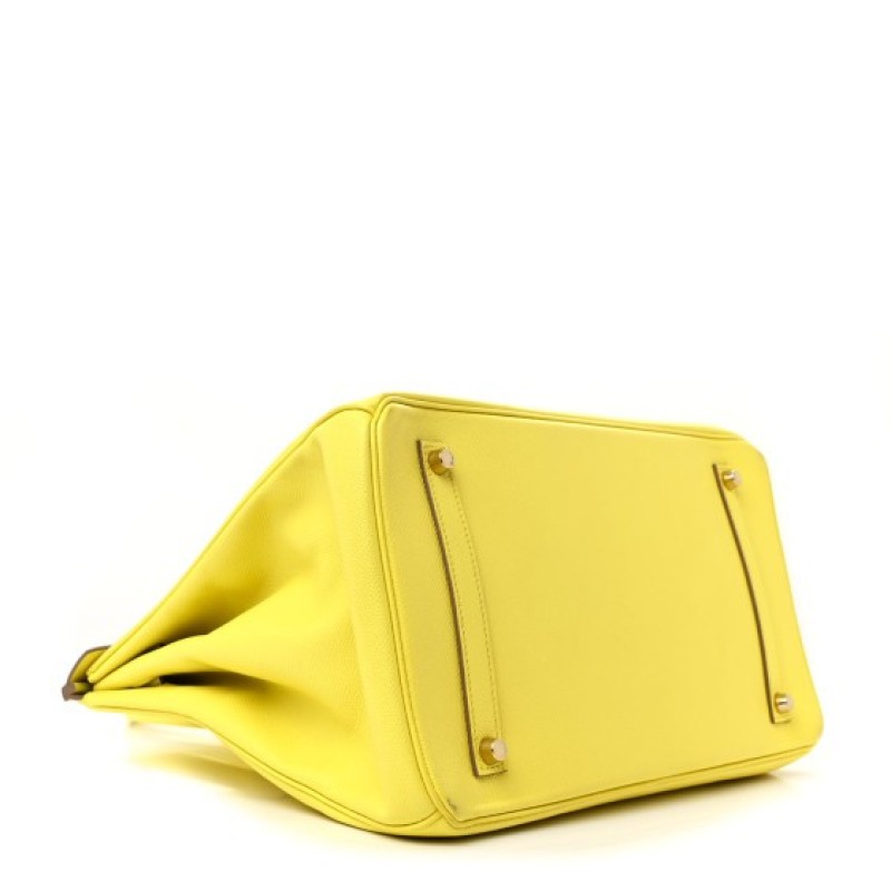 This is an authentic HERMES Epsom Birkin 35 in Lime. This Birkin handbag tote is crafted of durable epsom calfskin leather in vibrant yellow. The bag features rolled leather top handles, a cross-over flap, and a leather strap closure with polished rose gold hardware including a turn lock and a hanging clochette with keys to the padlock. This opens to a matching chevre goatskin leather interior with zipper and patch pockets.