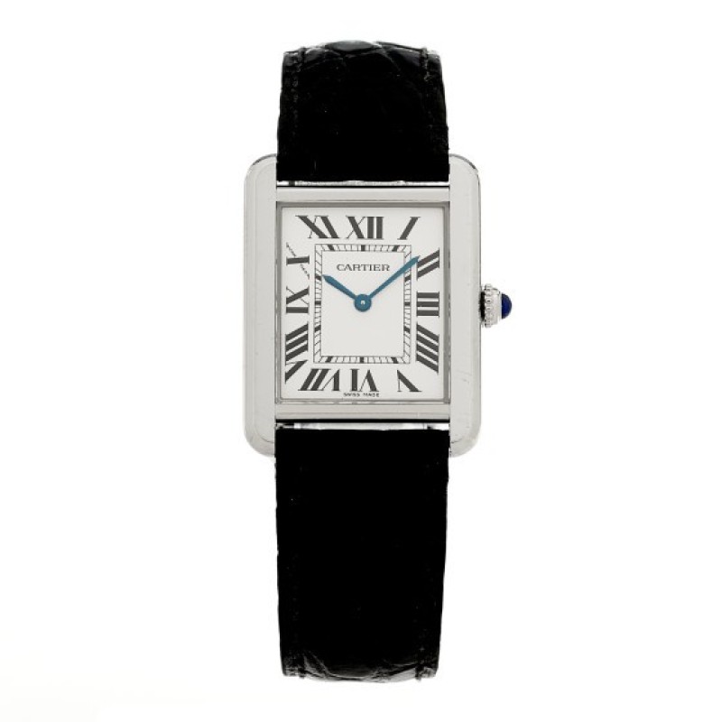 This is an authentic CARTIER Stainless Steel Alligator 24mm Tank Solo Quartz Watch. The watch is crafted of stainless steel and features a white dial with black Roman numeral hour markers, blue sword-shaped hands, blue spinel cabochon crown, sapphire crystal, black alligator strap, and a quartz movement.