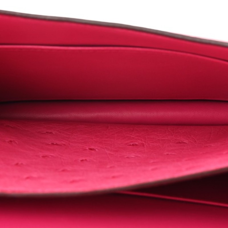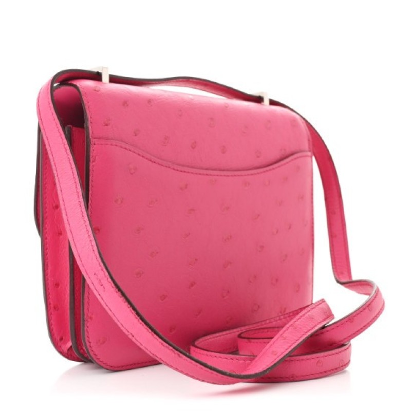 This is an authentic HERMES Ostrich Constance 18 in Rose Shocking. This stylish shoulder bag is finely crafted of ostrich leather in pink. The bag features a long shoulder strap with silver palladium-plated hardware, including an H buckle at the flap. This opens to a partitioned smooth leather interior with a flat pocket.