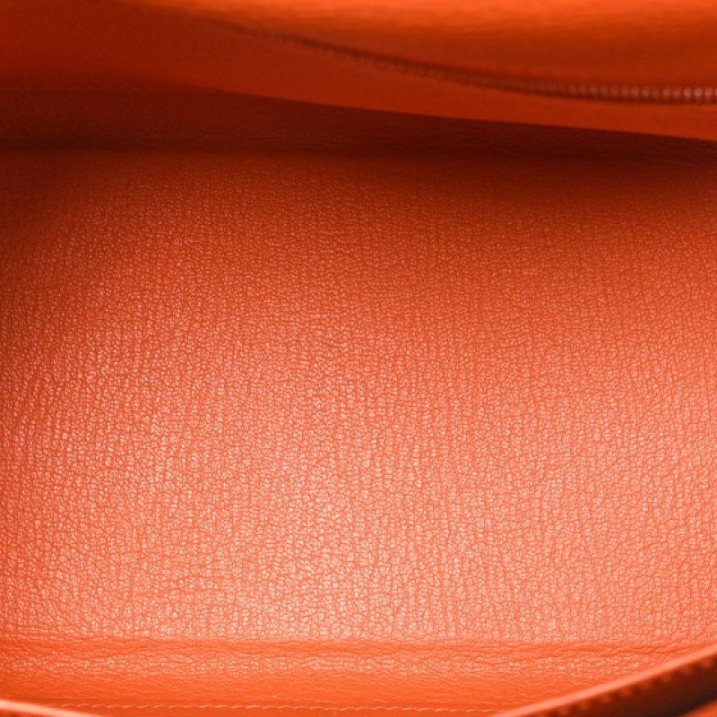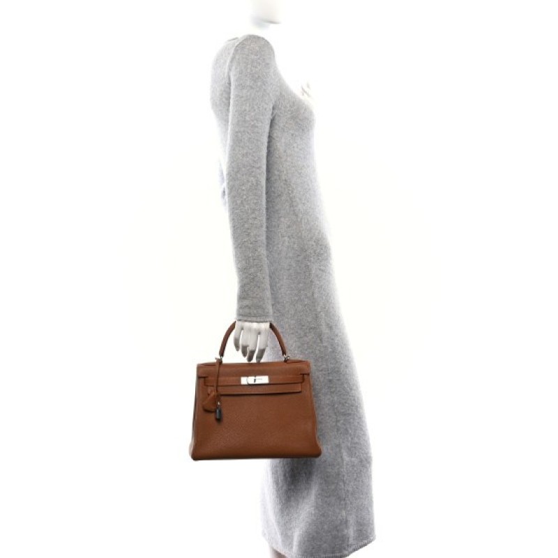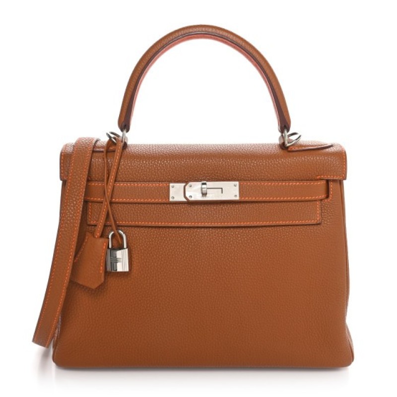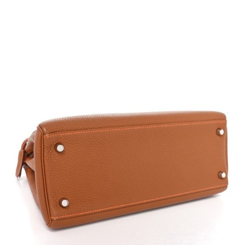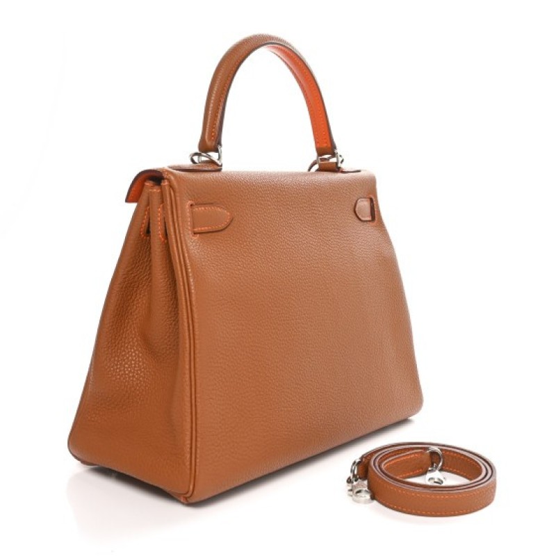 This is an authentic HERMES Togo Kelly Retourne 28 in Gold Orange. This stylish tote is crafted of beautiful togo calfskin leather in golden brown. The bag features a reinforced leather top handle with silver plated links, an optional shoulder strap, a cross-over flap, strap closure, and a signature gold Kelly turn lock. This opens to a orange leather interior with zipper and patch pockets.