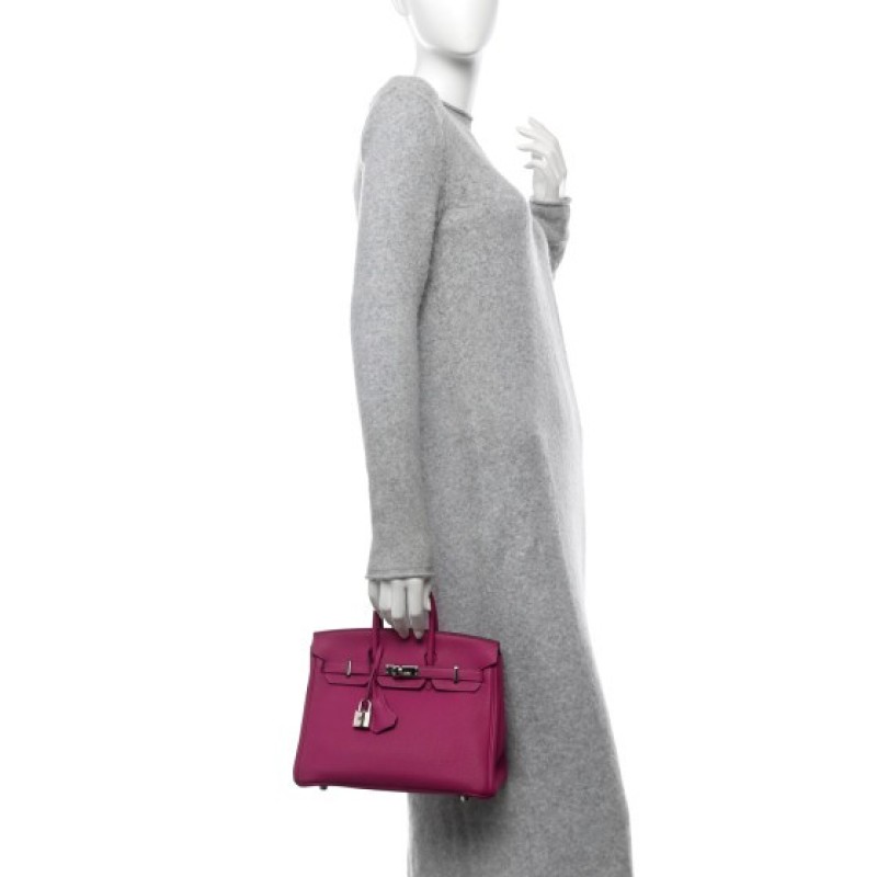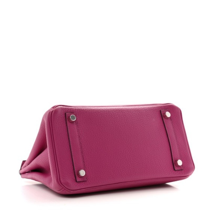 This is an authentic HERMES Togo Birkin 25 in Rose Pourpre. This bag is crafted of rich dark pink grained calfskin leather. It features rolled leather top handles and palladium silver hardware. The top opens to a matching goatskin leather interior with zipper and patch pockets.