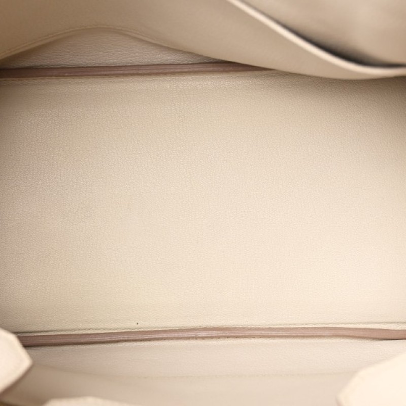 This is an authentic HERMES Togo Birkin 30 in Beton. This handbag is finely crafted of grained calfskin leather in off white. It features rolled leather top handles, a leather belt and gold plated hardware. It includes a turn lock and a hanging clochette with keys. The front flap opens to a matching goatskin leather interior with zipper and pockets.