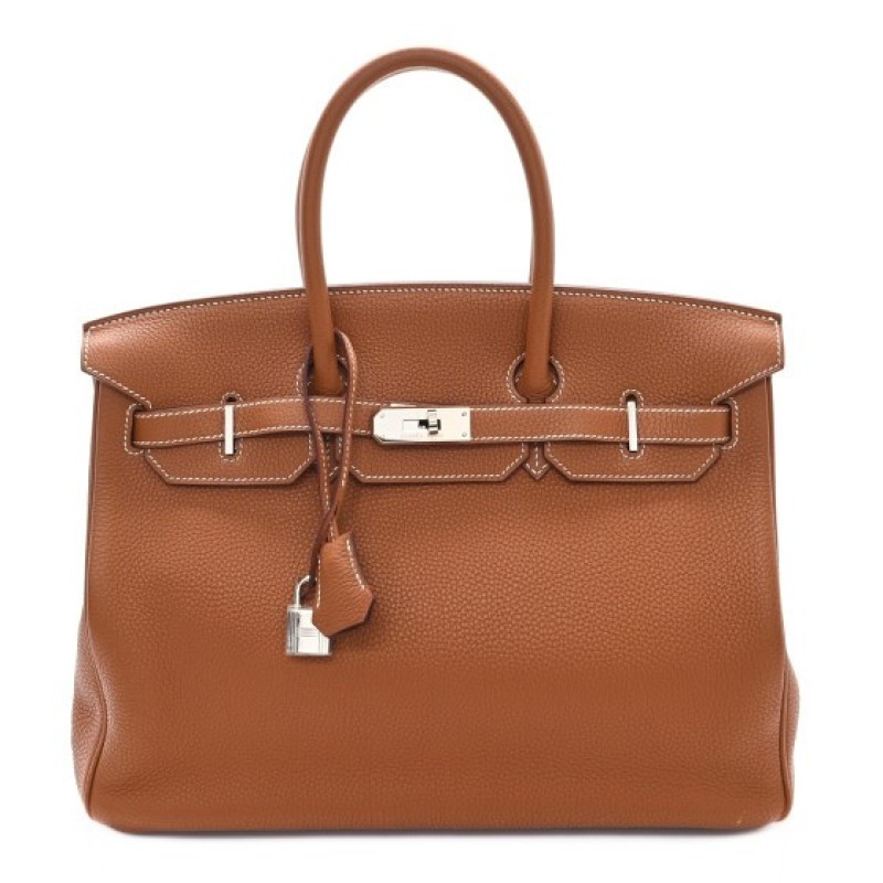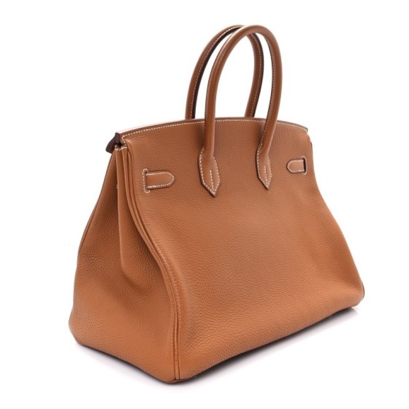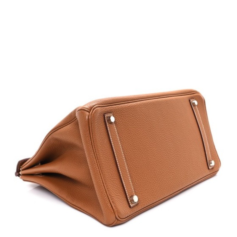 This is an authentic HERMES Togo Birkin 35 in Gold. This handbag is finely crafted of grained togo leather in a classic camel brown with white contrast stitching. It features rolled leather top handles, a front flap with strap closure, and polished palladium hardware. The top flap opens to a matching brown chèvre leather interior with zipper and patch pockets.
