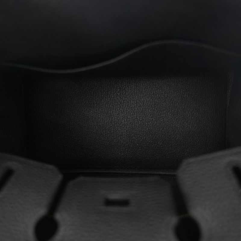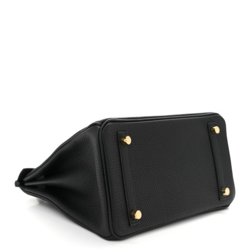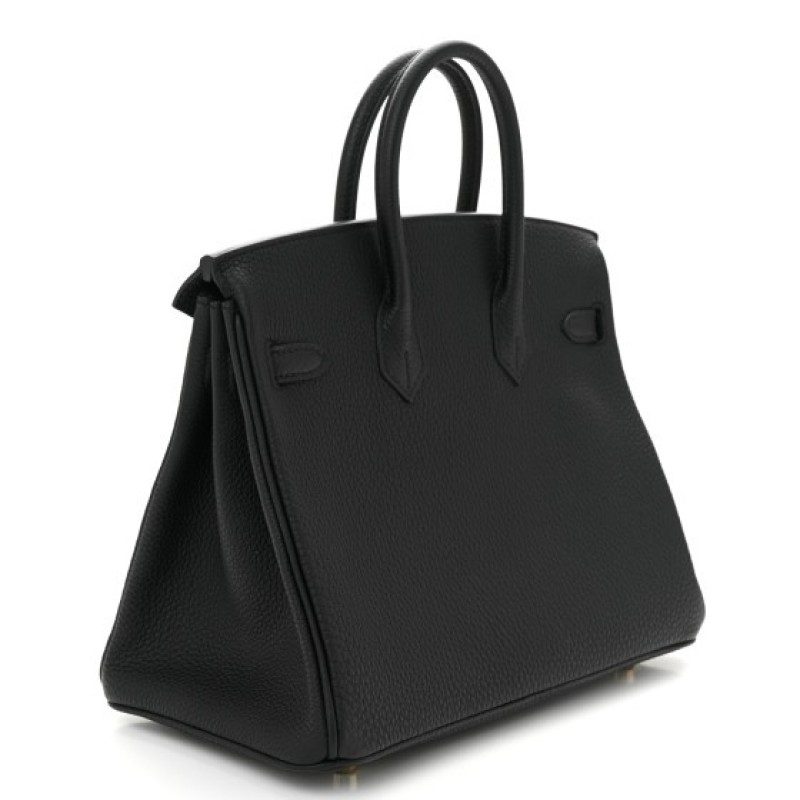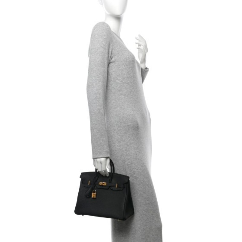 This is an authentic HERMES Togo Birkin 25 in Black. This stunning Birkin handbag is crafted of textured calfskin togo leather in black. The luxurious handbag features looping leather top handles, a cross-over flap, and a strap closure with gold hardware links and a polished palladium padlock including a hanging clochette with keys. The flap opens to a matching chevre leather interior with zipper and patch pockets.