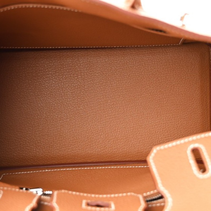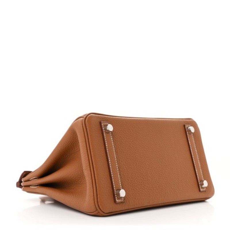 This is an authentic HERMES Togo Birkin 25 in Gold. This classic handbag is beautifully crafted of togo calfskin leather in golden brown. The bag features rolled leather top handles, a short front flap and strap closure, and palladium plated hardware including a padlock and keys inside a leather clochette. This opens to a goatskin leather interior with zipper and patch pockets.