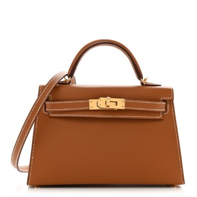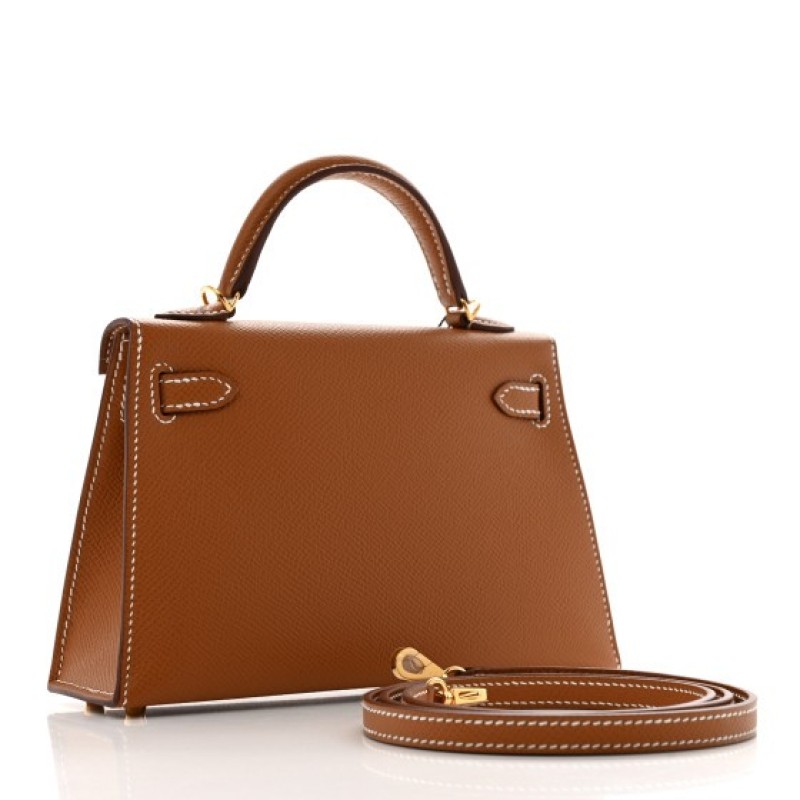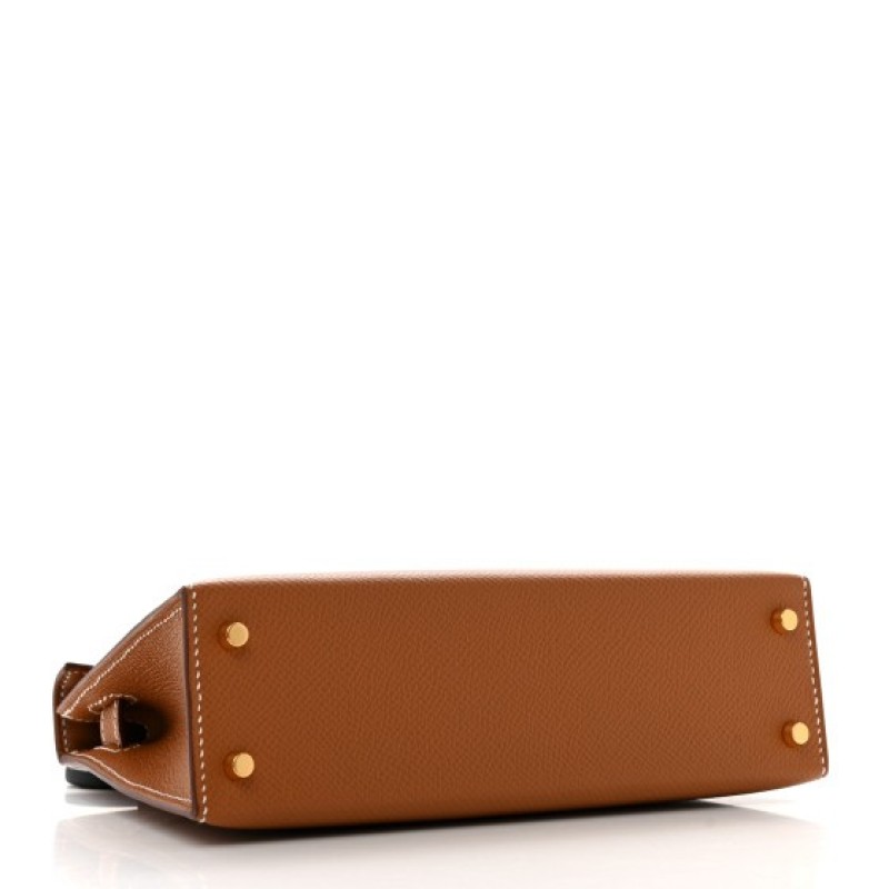 This is an authentic HERMES Epsom Mini Kelly Sellier 20 in Gold. This stunning Hermes classic handbag is beautifully crafted in stamped Epsom calfskin leather in golden brown. It features a single rolled leather top handle with gold hardware and an optional leather shoulder strap. The traditional Kelly turn lock secures the small flap, which opens to a leather interior with a flat pocket.