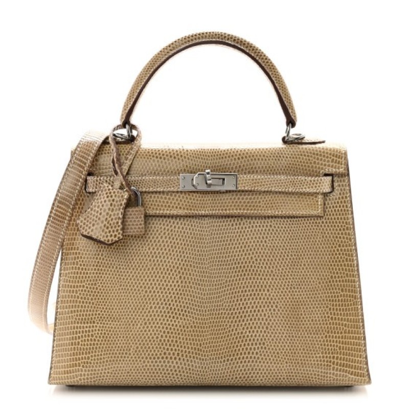 This is an authentic HERMES Lizard Niloticus Kelly Sellier 25 in Ficelle. This handbag is handcrafted of shiny lizard leather in beige. The bag features a rolled lizard skin top handle, an optional shoulder strap, a frontal flap with a strap closure, and polished ruthenium hardware. The top flap opens to a beige goatskin interior with zipper and patch pockets.