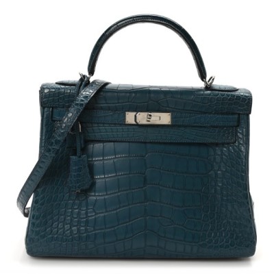 This is an authentic HERMES Matte Alligator Kelly Retourne 32 in Colvert. This chic and iconic handbag is expertly handcrafted of blue matte exotic alligator. The bag features an optional shoulder strap, a frontal flap with a strap closure, and palladium-plated hardware, including a matte, exotic alligator-covered padlock and keys. The top flap opens to reveal a matching colored chevre goatskin leather interior, featuring a zipper and a patch pocket.