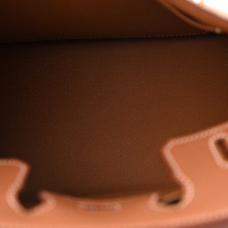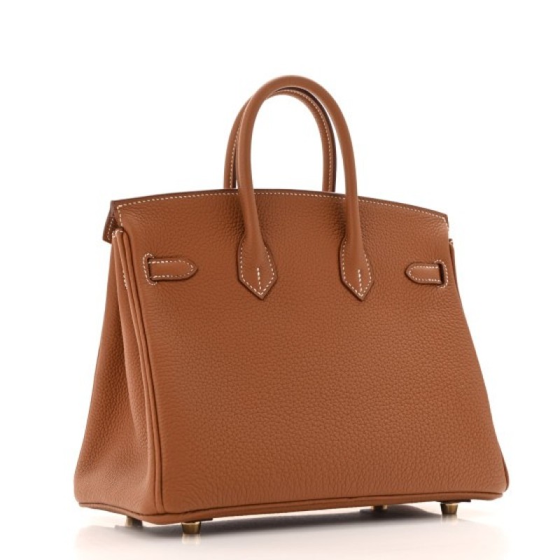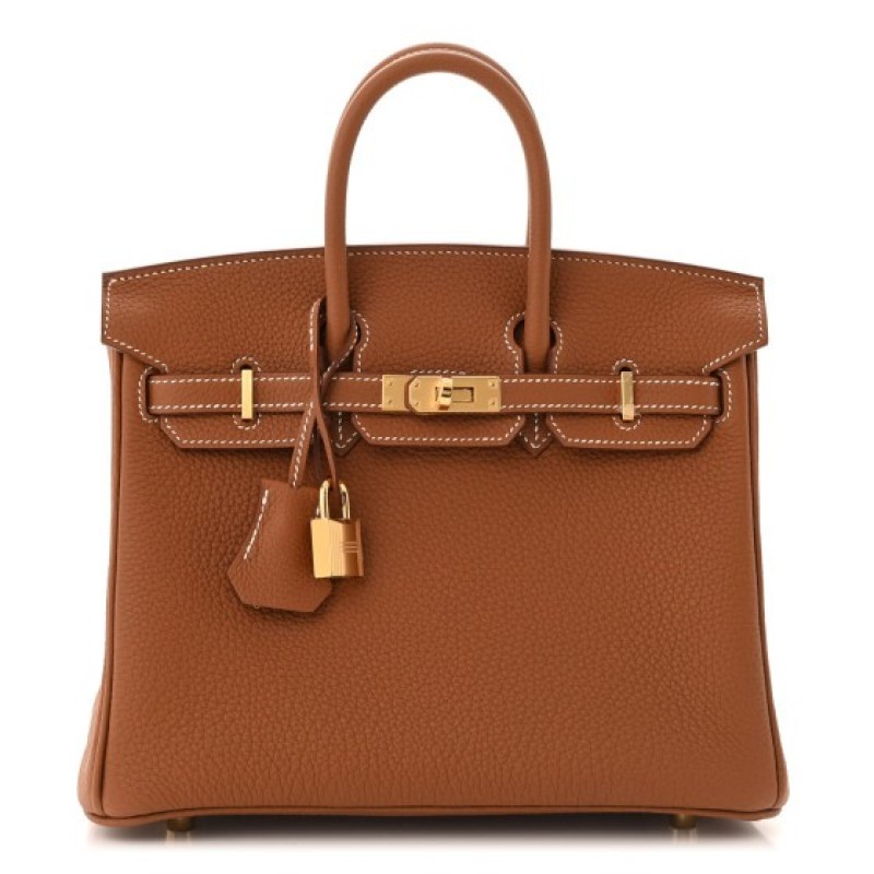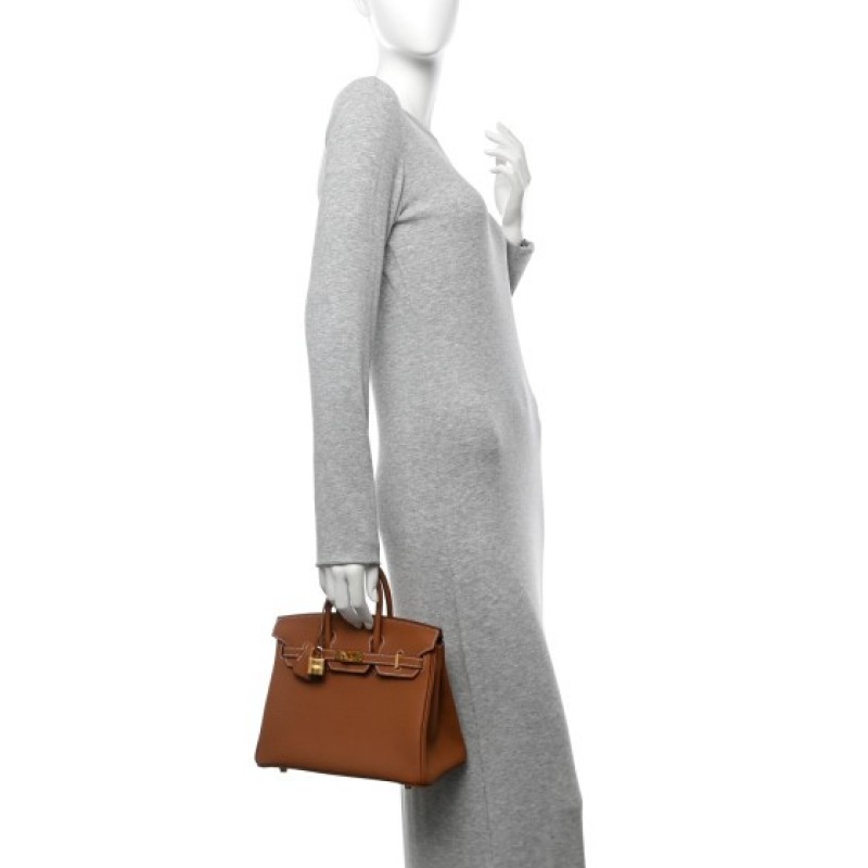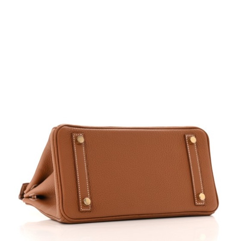 This is an authentic HERMES Togo Birkin 25 in Gold. This classic handbag is beautifully crafted of togo calfskin leather in golden brown. The bag features rolled leather top handles, a short front flap and strap closure, and gold-plated hardware including a padlock and keys inside a leather clochette. This opens to a goatskin leather interior with zipper and patch pockets.