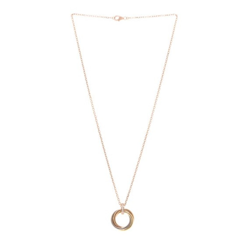 This is an authentic CARTIER 18K Pink Yellow White Gold Diamond Trinity Pendant Necklace. The necklace is crafted of 18 karat pink, yellow, and white gold, and features a pendant of three interlocking rings and a bail set with five diamonds, approximately .08 carat.