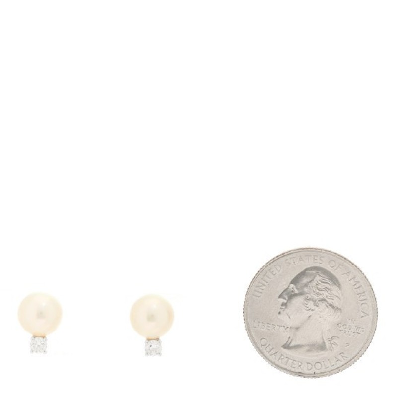 This is an authentic pair of MIKIMOTO 18K White Gold Diamond Akoya Pearl 8-8.5mm Stud Earrings. The earrings are crafted of 18-karat white gold and feature an Akoya cultured pearls accented with round brilliant cut diamonds weighing approximately .20 total carat weight.