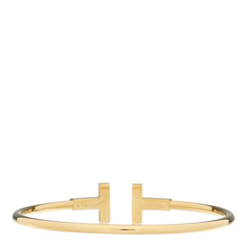 This is an authentic TIFFANY 18K Yellow Gold Black Onyx T Wire Bracelet. The bracelet is crafted of 18 karat yellow gold and features two black onyx inlayed 'T' motifs on either end of a flexible wire cuff.