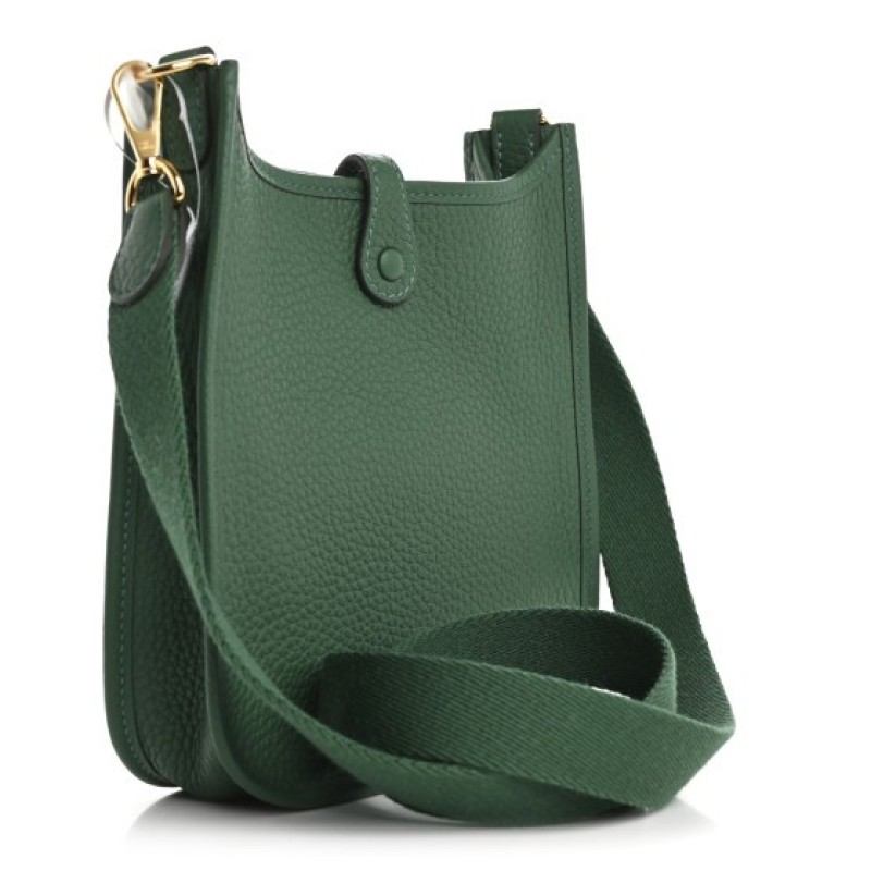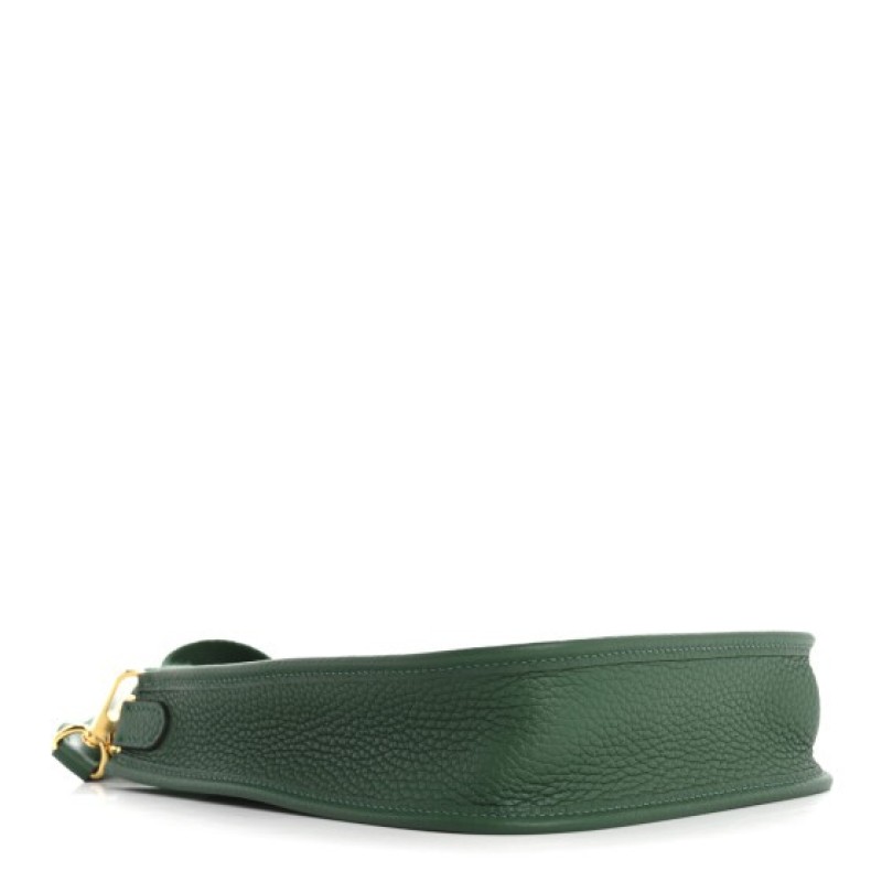 This is an authentic HERMES Taurillon Clemence Evelyne TPM in Vert Moyen. This petite crossbody messenger bag is finely crafted of rich Taurillon Maurice calfskin leather in blue. The shoulder bag features a canvas body strap, polished gold hardware, and a perforated Hermes H inside an oval on the front of the bag. The top of the bag opens with a cross over strap to a blue suede interior.