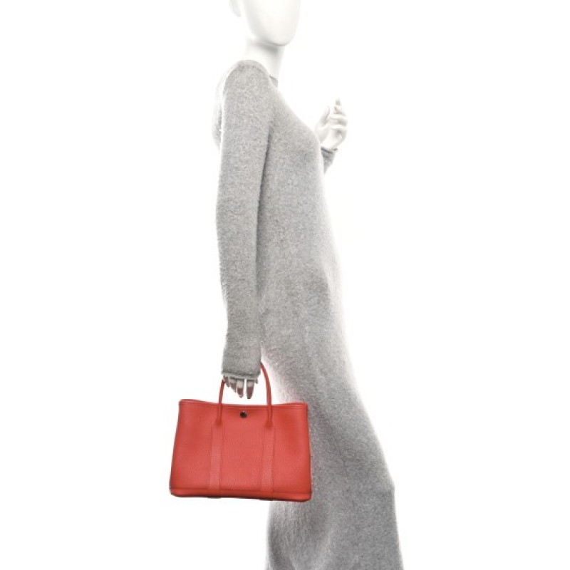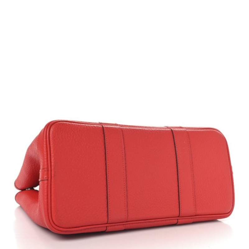 This is an authentic HERMES Vache Country Garden Party TPM 30 in Rouge Pivoine. This sophisticated tote is crafted of textured matte leather in a coral shade of red. The bag features rolled top handles that extend into a decorative trim and silver palladium hardware. The top snaps opens to an ivory herringbone fabric interior with a zipper pocket. This classic Hermes handbag is a showstopper!