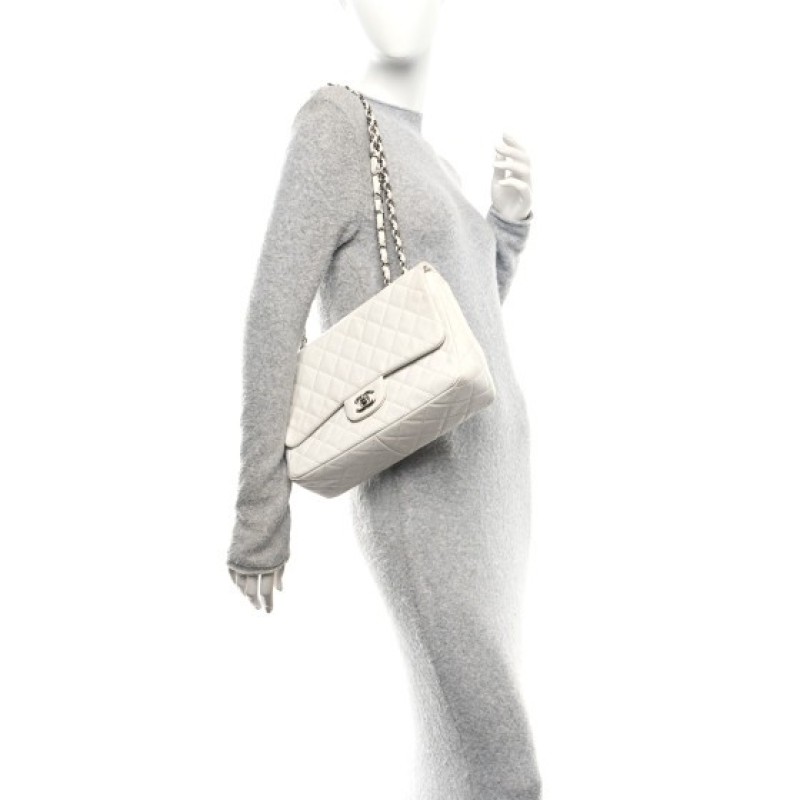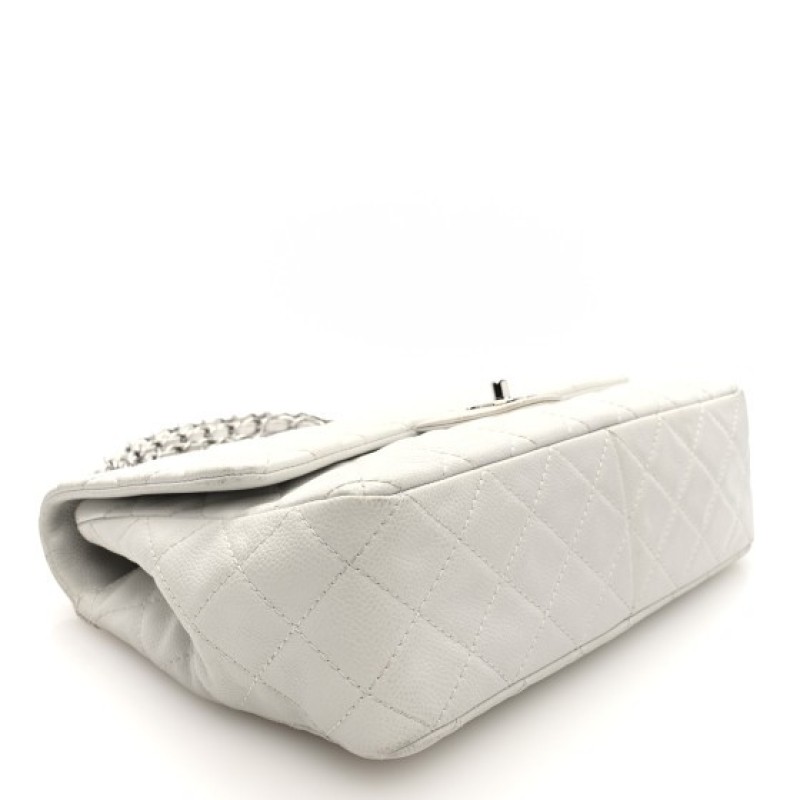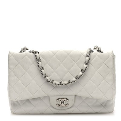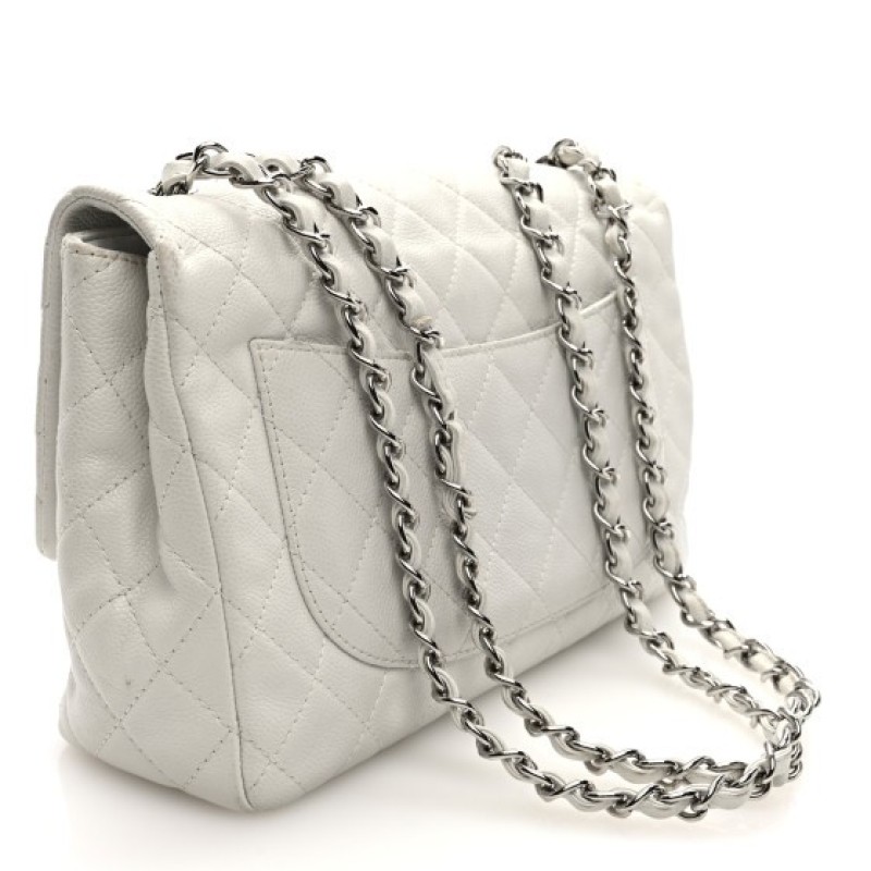 This is an authentic CHANEL Caviar Quilted Jumbo Single Flap in White. This stunning classic shoulder bag in the larger size is crafted of luxurious diamond quilted leather in white. The bag features leather threaded silver chain link shoulder straps and a Chanel CC turn lock for the front flap. This opens to a matte white leather interior with zipper and patch pockets.