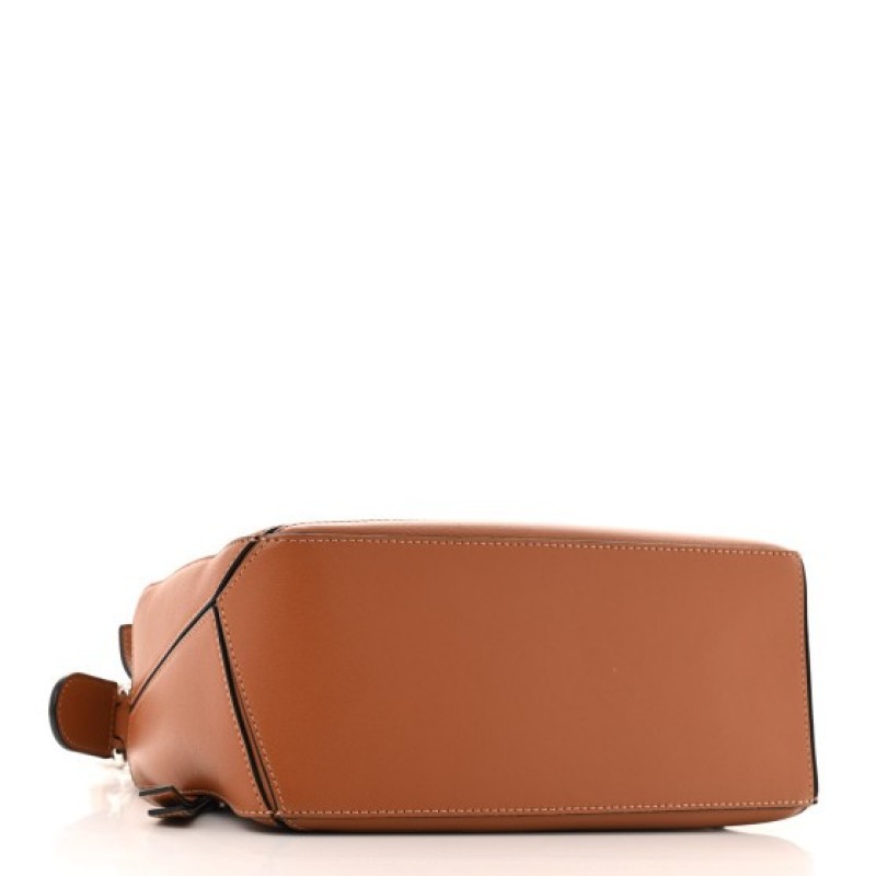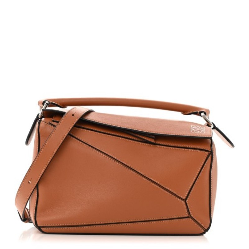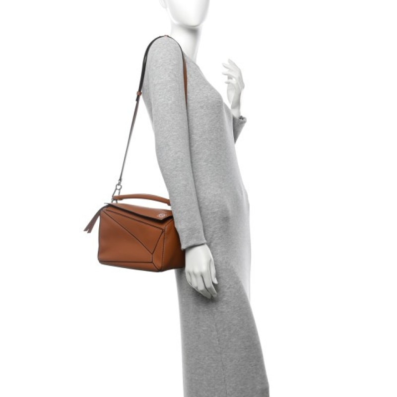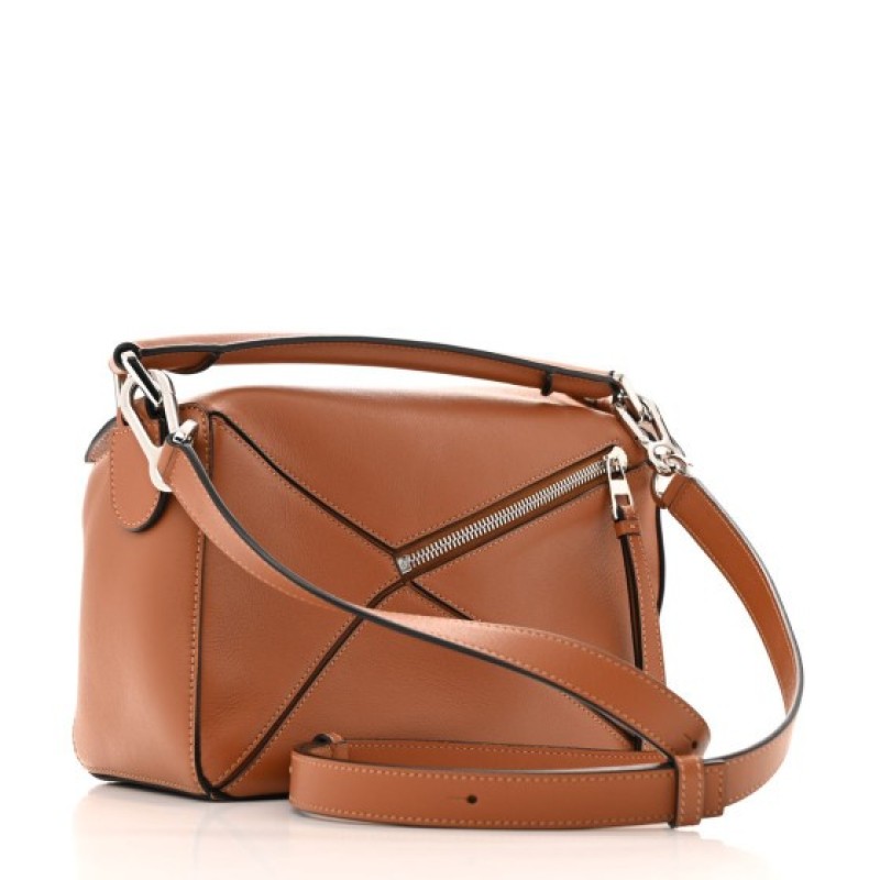 This is an authentic LOEWE Calfskin Small Puzzle Bag in Tan. This stunning shoulder bag is crafted of smooth calfskin leather in brown. The bag features a rolled leather handle, a rear zipper pocket, and an optional, adjustable leather shoulder strap with polished silver hardware. The top zipper opens to a natural fabric interior with a patch pocket.