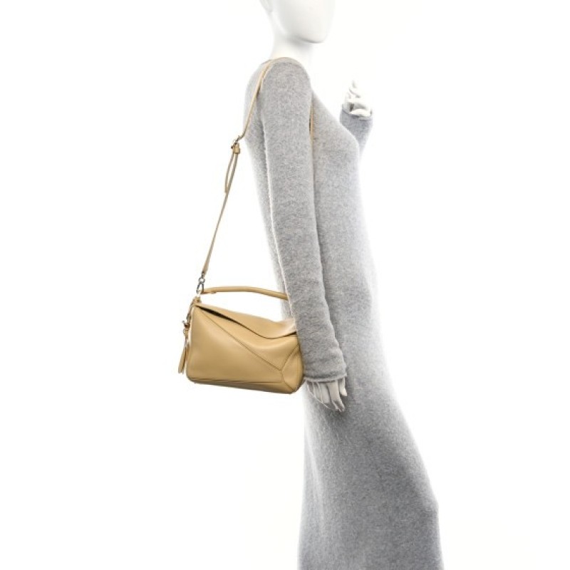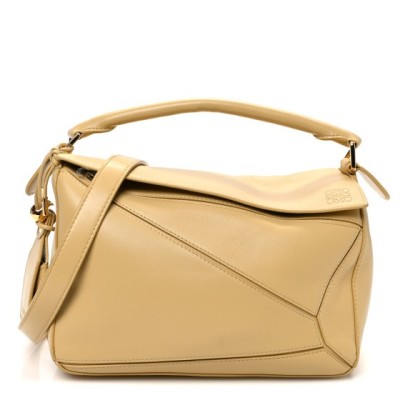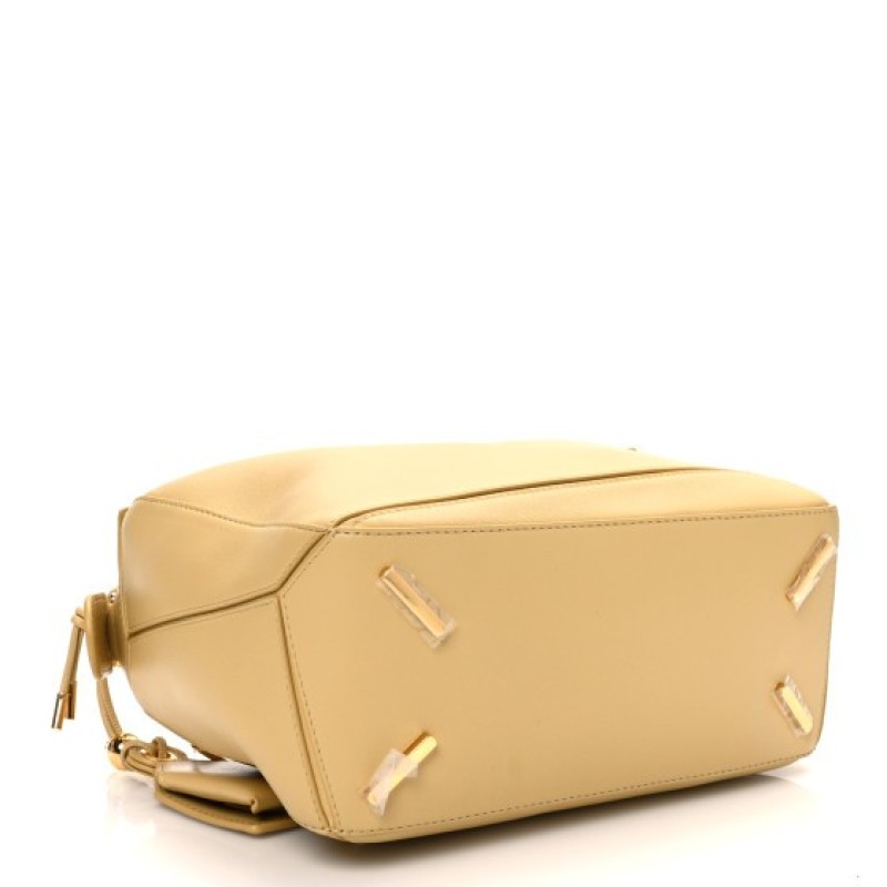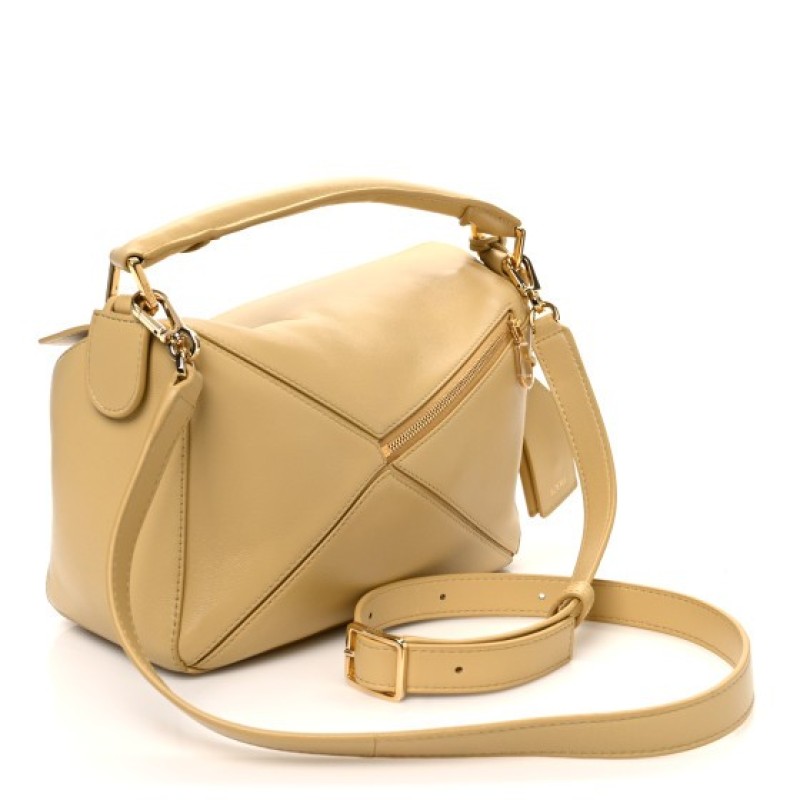 This is an authentic LOEWE Calfskin Small Puzzle Bag in Dark Butter. This chic bag is finely crafted of soft calfskin leather in a beautiful shade of yellow. The bag features a rear zipper pocket, a rolled leather top handle, and an optional, adjustable leather shoulder strap with polished gold hardware. The top zipper opens to a natural fabric interior with patch pockets.