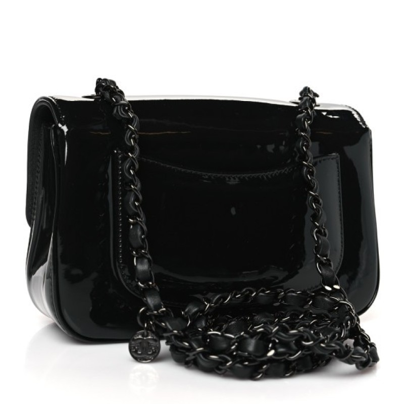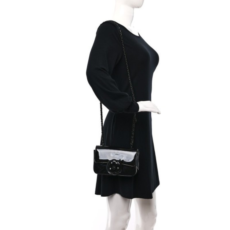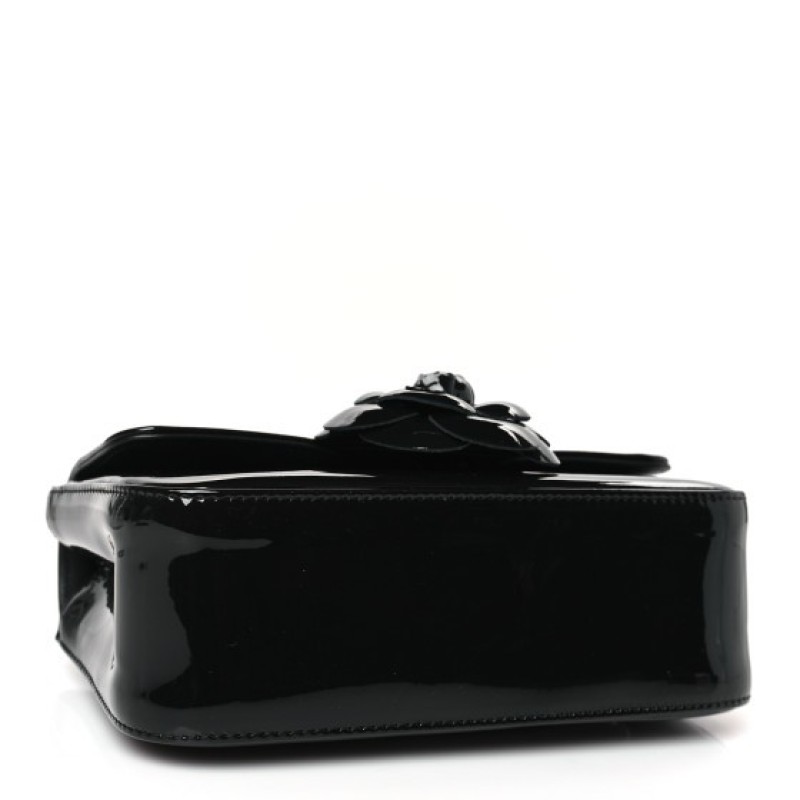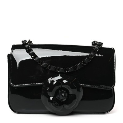 This is an authentic CHANEL Patent Calfskin Small Camellia Flap in Black. This stunning handbag is crafted of luxurious patent leather in black. The bag features leather threaded polished black chain shoulder straps and a frontal camellia flower clasp. This opens to a leather interior with a patch pocket and zipper pocket.