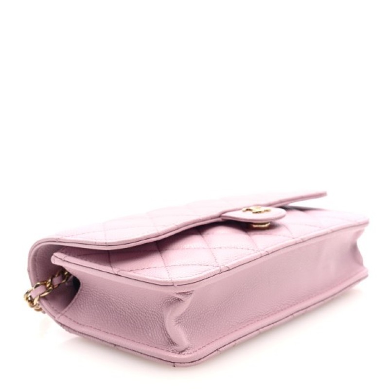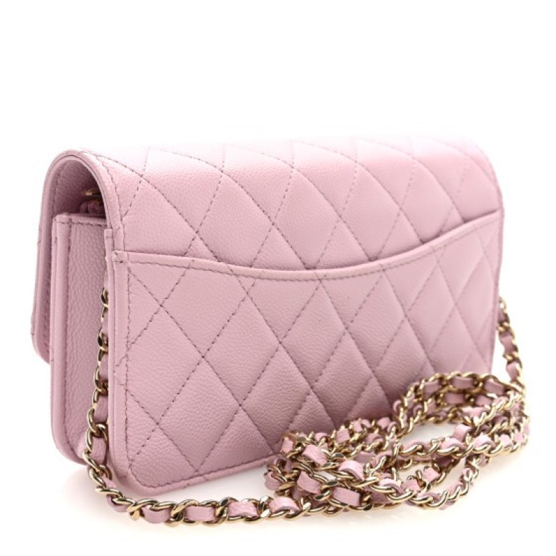 This is an authentic CHANEL Caviar Quilted Clutch With Chain in Pink. This chic shoulder bag is finely crafted of luxurious diamond quilted caviar leather in pink. The bag features arear pocket, a leather-threaded gold chain shoulder strap and a gold Chanel CC symbol on the front. The top zipper opens to a matching pink fabric interior with a zipper pocket and a patch pocket.