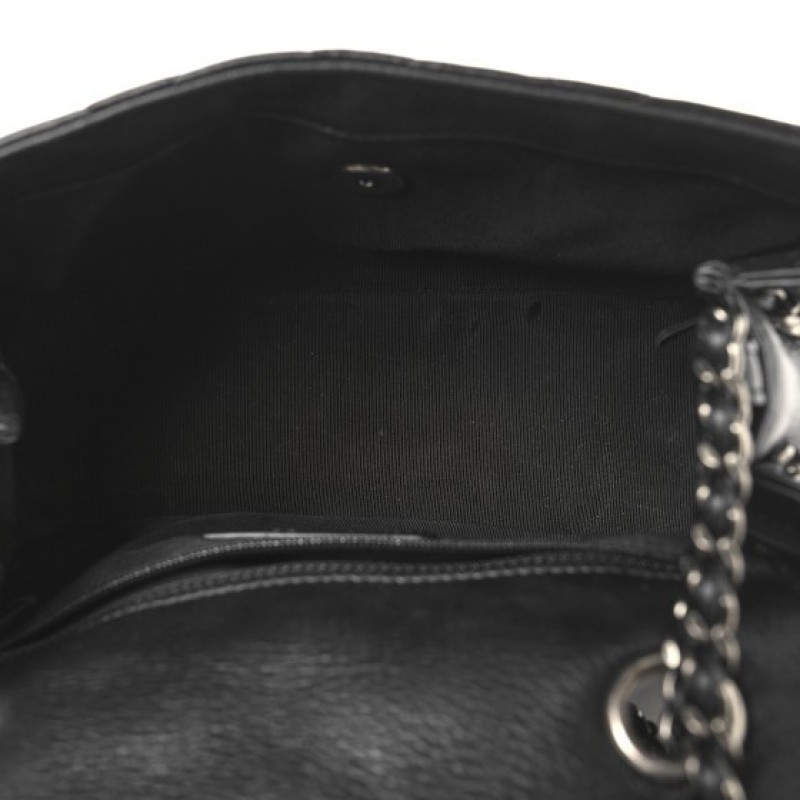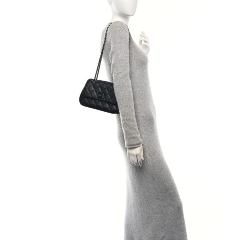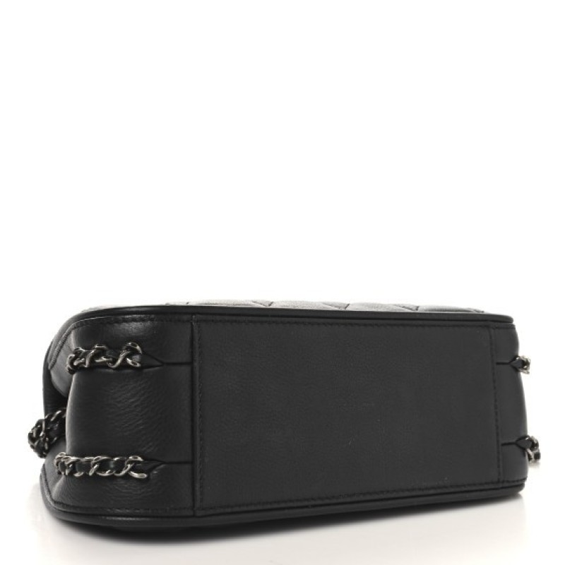 This is an authentic CHANEL Calfskin Quilted Small Frame In Chain Flap in Black. This chic style flap features luxurious padded calfskin leather in a signature diamond shaped quilting. There are prominent ruthenium chain link leather threaded shoulder straps and the flap features a matching ruthenium and leather Chanel CC turn lock, which opens to a black fabric interior with zippered pockets.