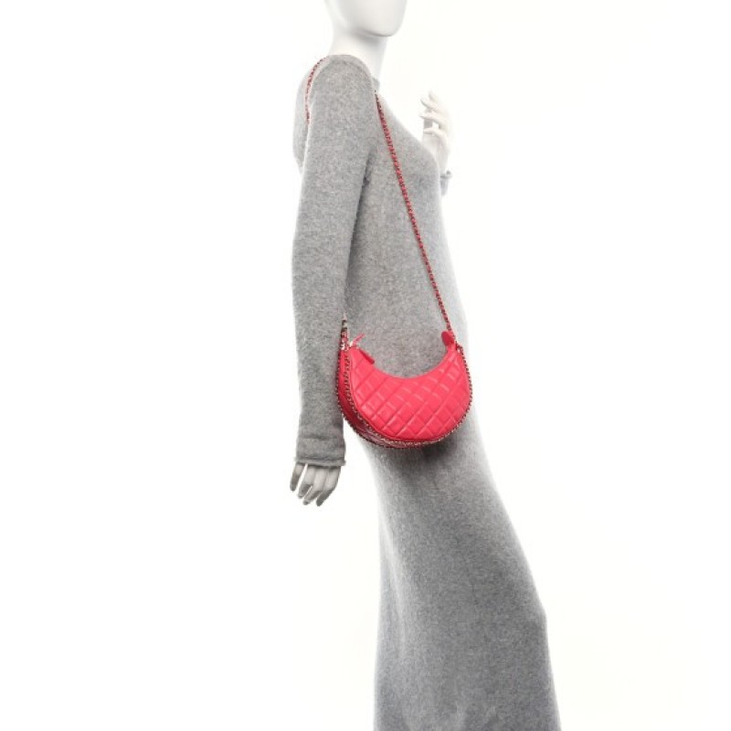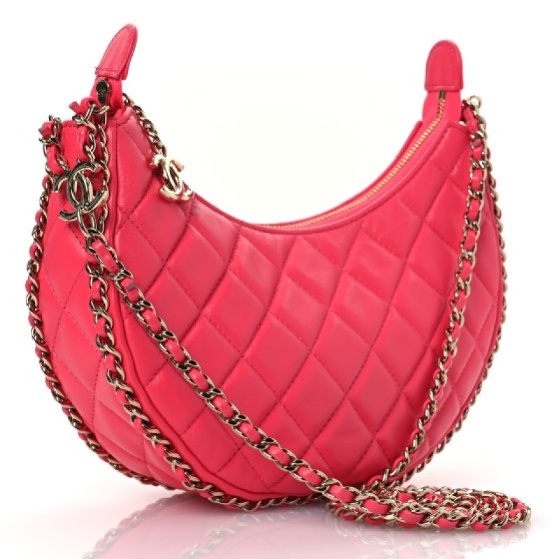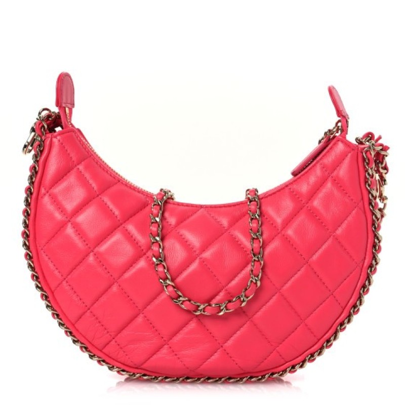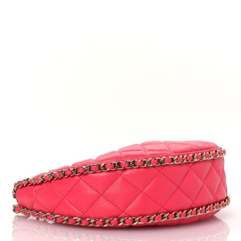 This is an authentic CHANEL Lambskin Quilted Chain Around Hobo in Pink. This chic classic shoulder bag is composed of fine diamond quilted lambskin leather in pink. This bag features leather threaded gold chain link trim that extends to the leather top handle and a gold CC logo on the front. The top zipper opens to a matching fabric interior with a patch pocket.