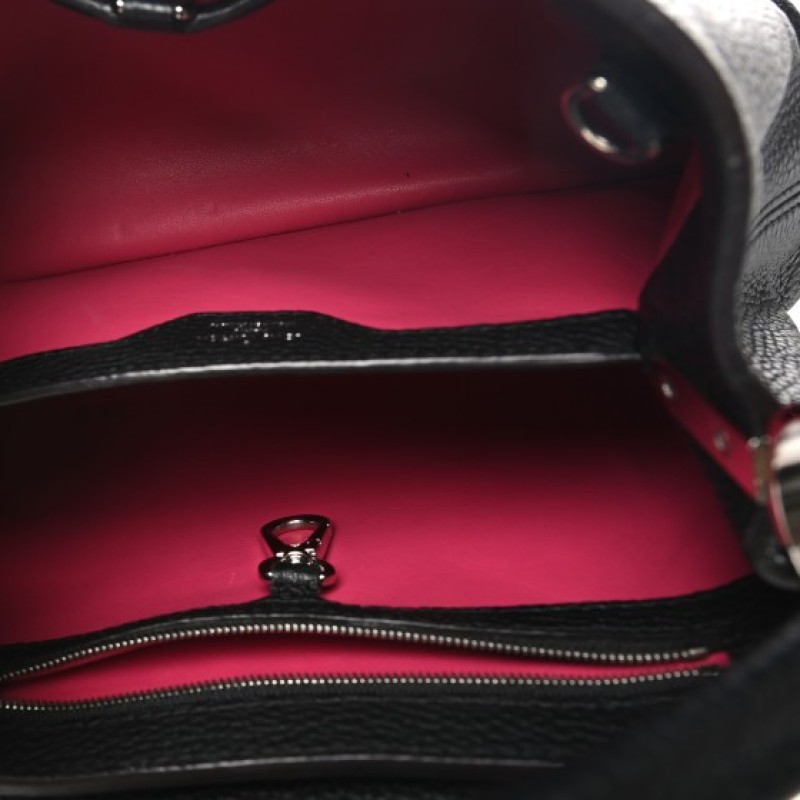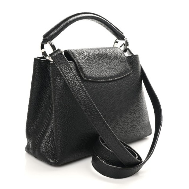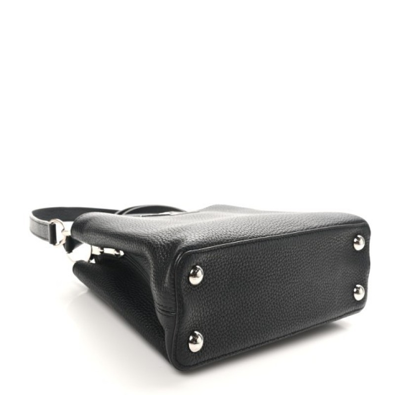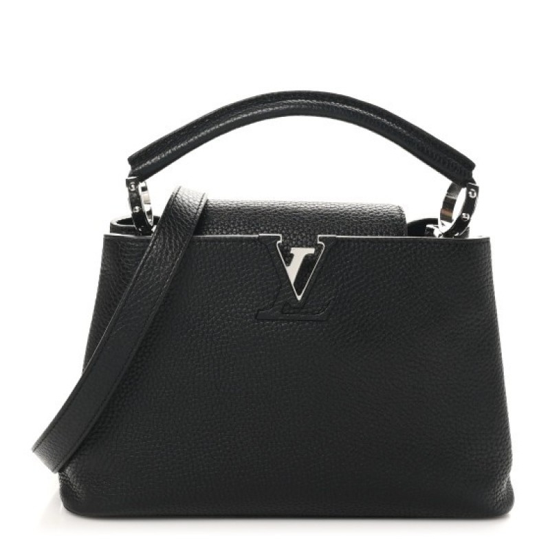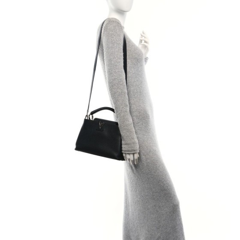 This authentic LOUIS VUITTON Taurillon Capucines BB in Matte Black. This beautiful bag is crafted of textured leather in black. This handbag features an leather top handle, optional shoulder strap, a flap closure, and black hardware. The top opens to a black leather interior with a zipper pocket.