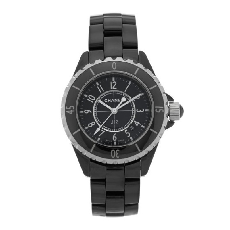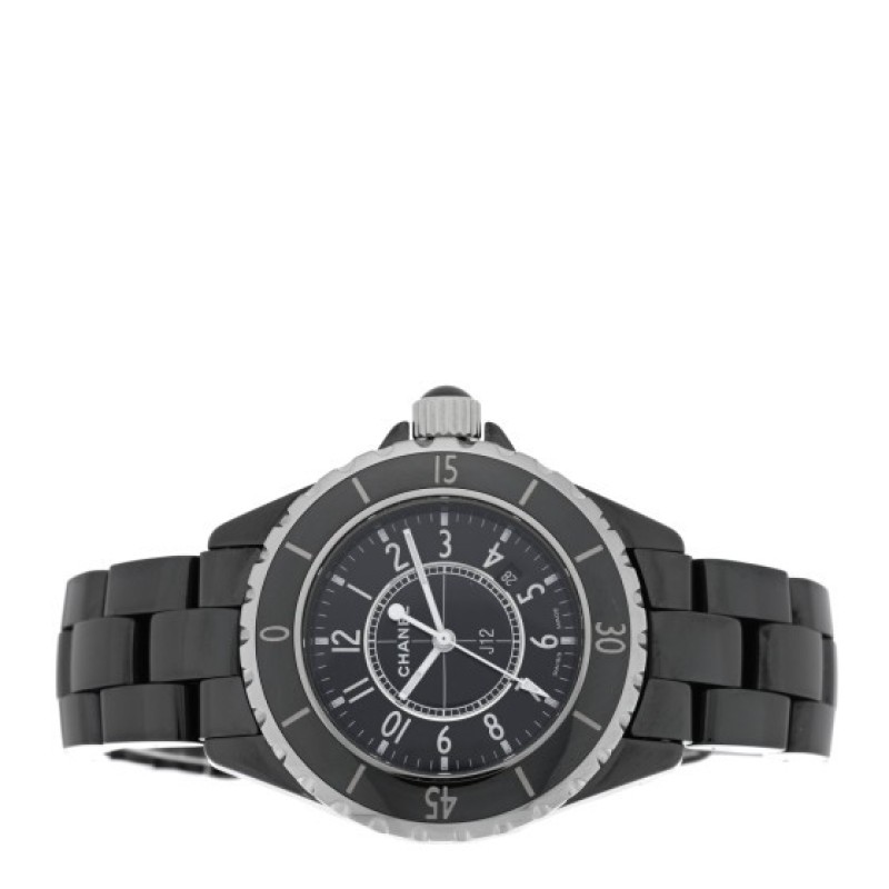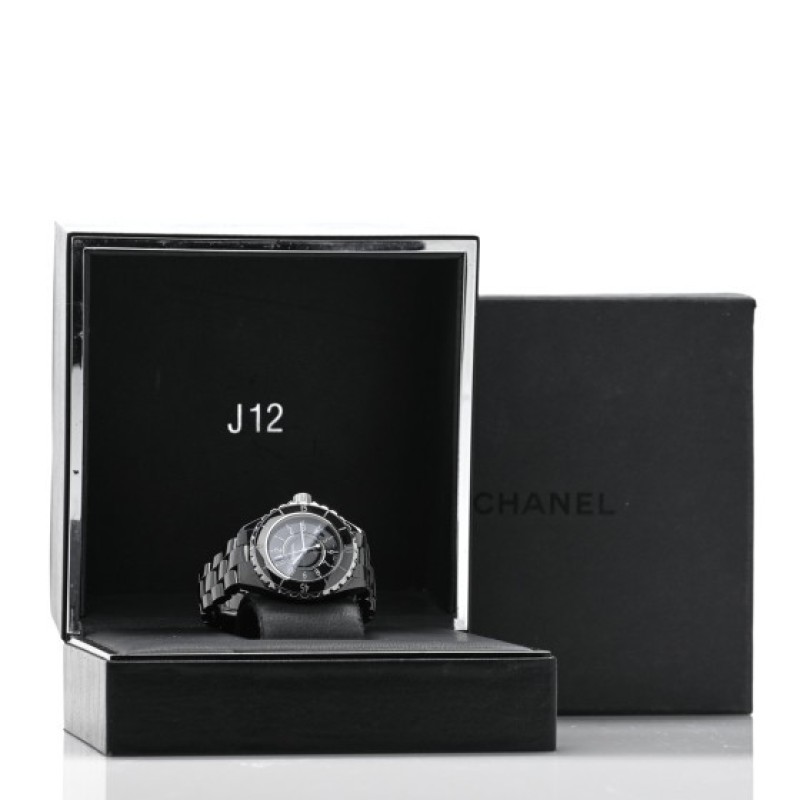 This is an authentic CHANEL Stainless Steel Ceramic 33mm J12 Quartz Watch Black. The watch is crafted of black ceramic and stainless steel, and features a black dial with white hour markers and hands, uni-directional bezel, ceramic link bracelet, and a quartz movement.
