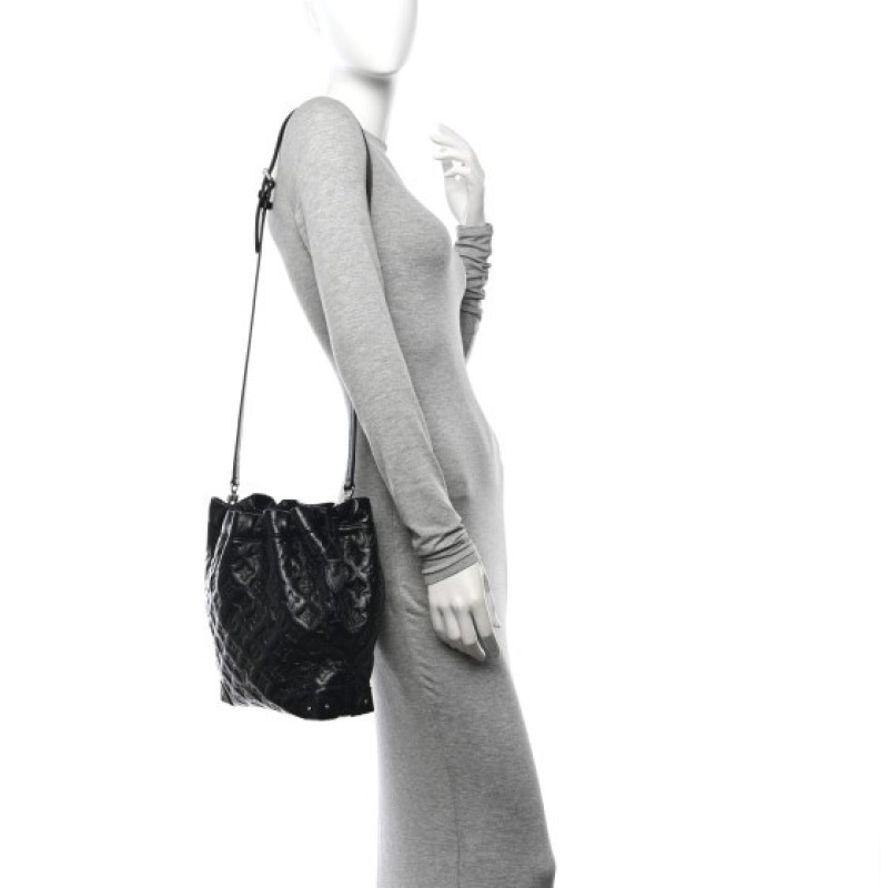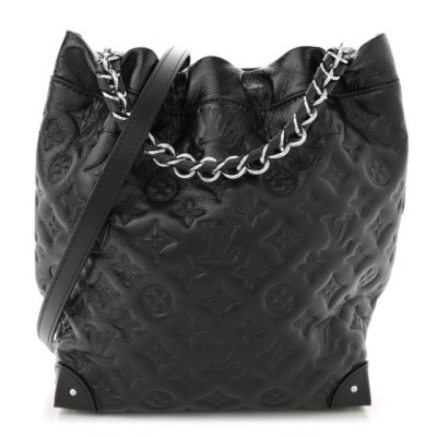 This is an authentic LOUIS VUITTON Lambskin Monogram Shadow Coussin Noe Trunk PM in Black. This classic bucket style shoulder bag is crafted of glossy black leather with the Louis Vuitton monogram embossed throughout. The bag features an adjustable leather shoulder strap, an optional leather threaded silver chain strap, top cinch strap and polished silver hardware. This opens to a black microfiber interior.