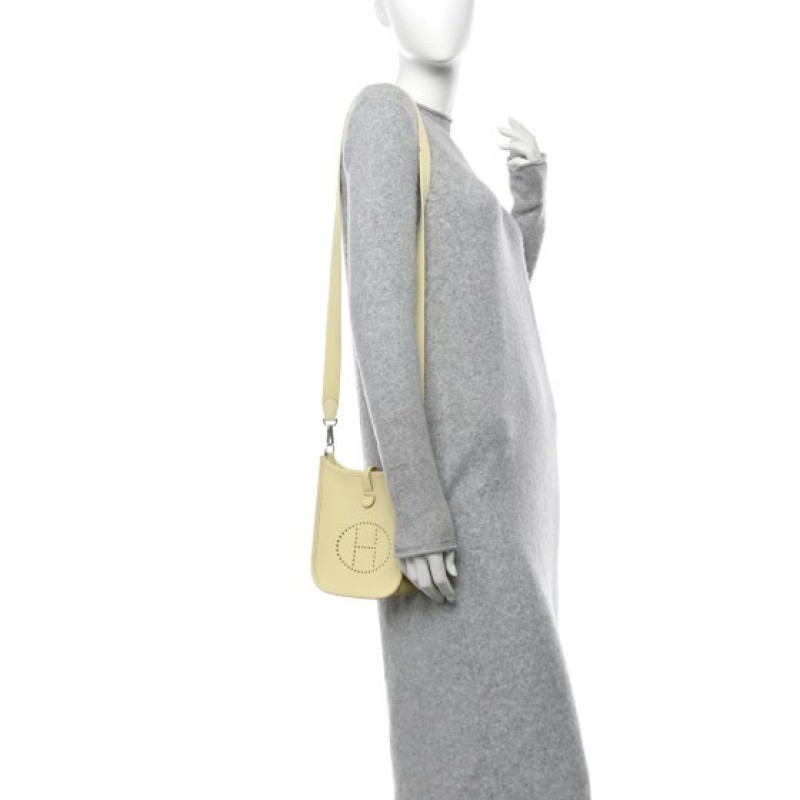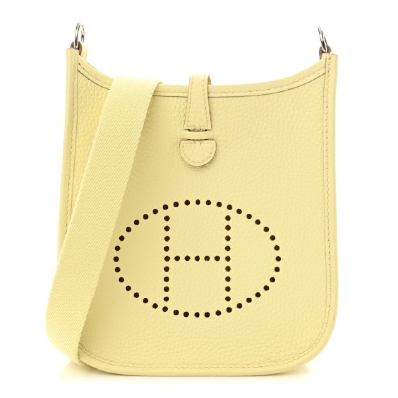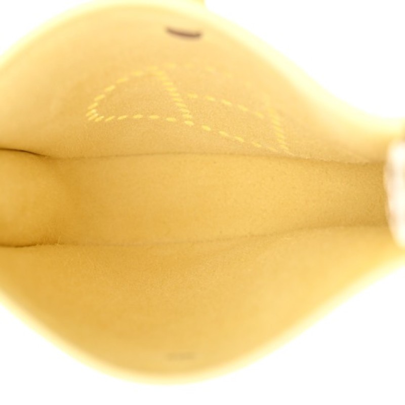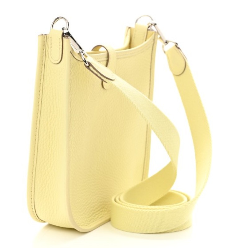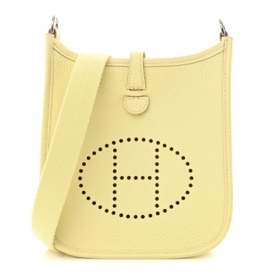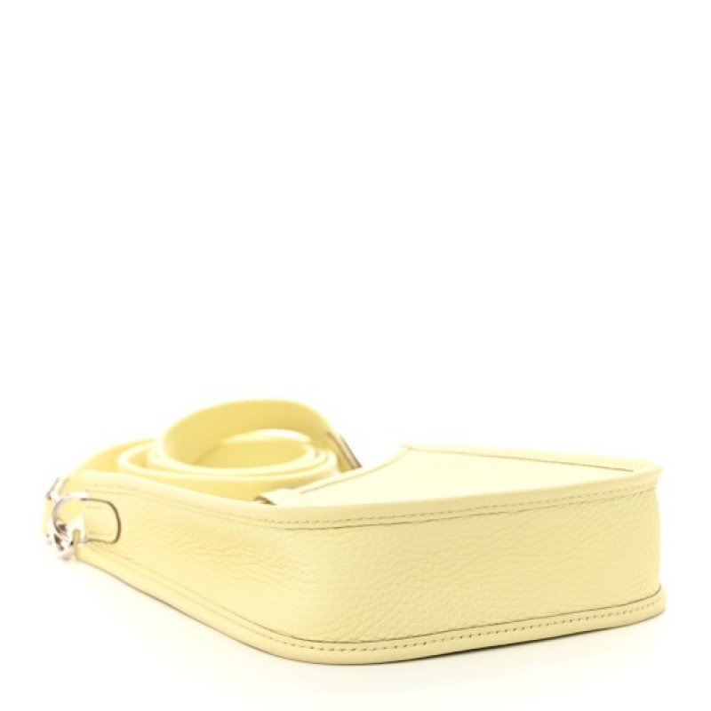 This is an authentic HERMES Taurillon Clemence Evelyne TPM in Jaune Milton. This stylish small messenger bag is crafted of textured Taurillon Clemence calfskin leather in light yellow. It features a perforated Hermes H oval, a canvas crossbody strap, and palladium hardware. The top of the bag opens with a crossover strap to a matching suede interior.