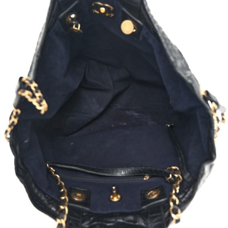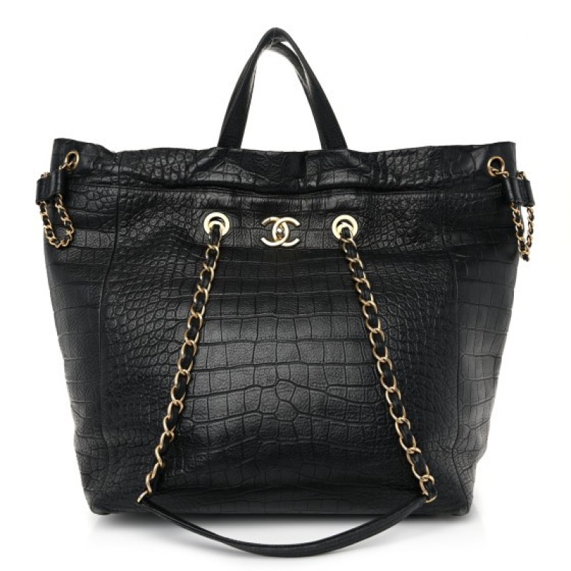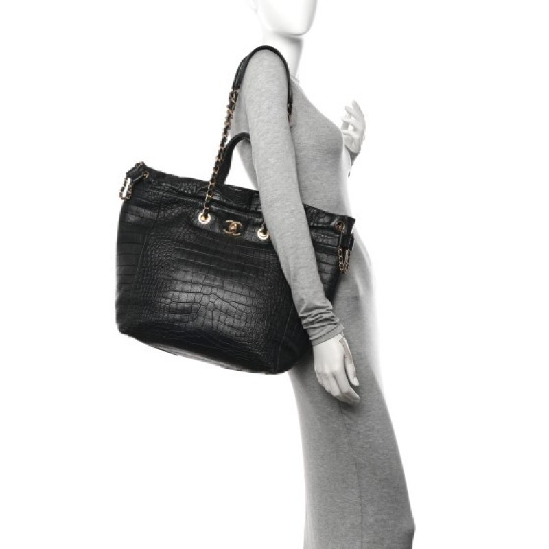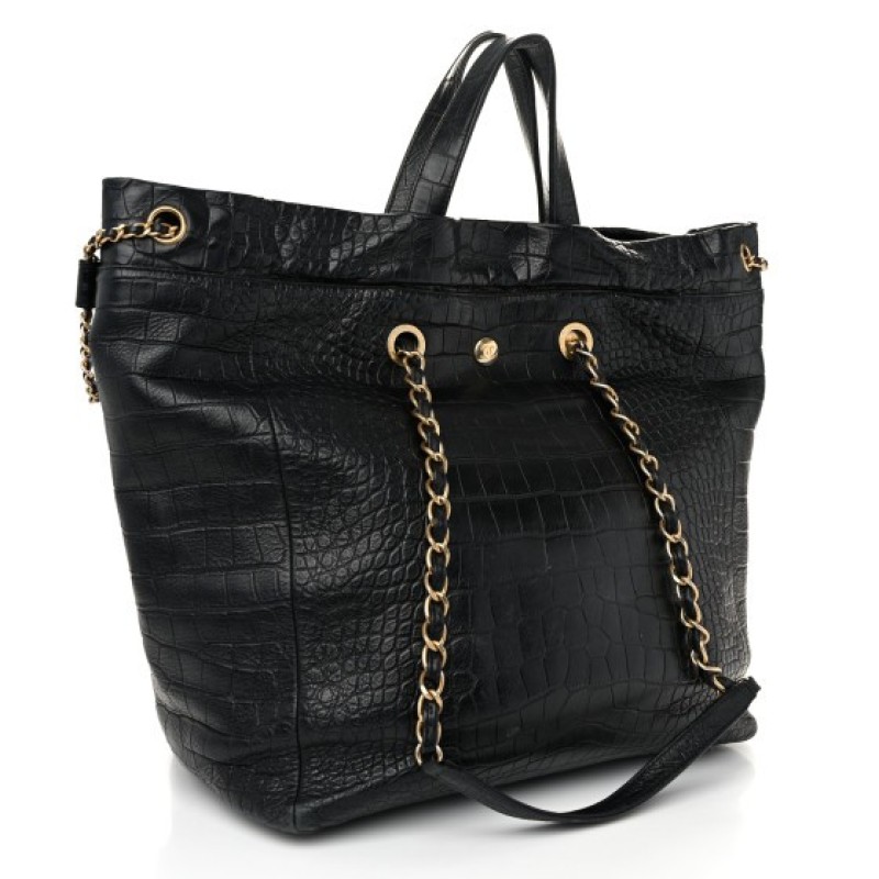 This is an authentic CHANEL Crocodile Embossed Calfskin Large Crocodile Shopping Tote in Black. This stylish handbag is crafted of shiny crocodile embossed calfskin leather in black. The bag features an interlocking CC turn lock, aged gold chain link shoulder straps threaded with leather and leather top handles. The cinch cord opening at the top releases to a black fabric interior with a zipper pocket.
