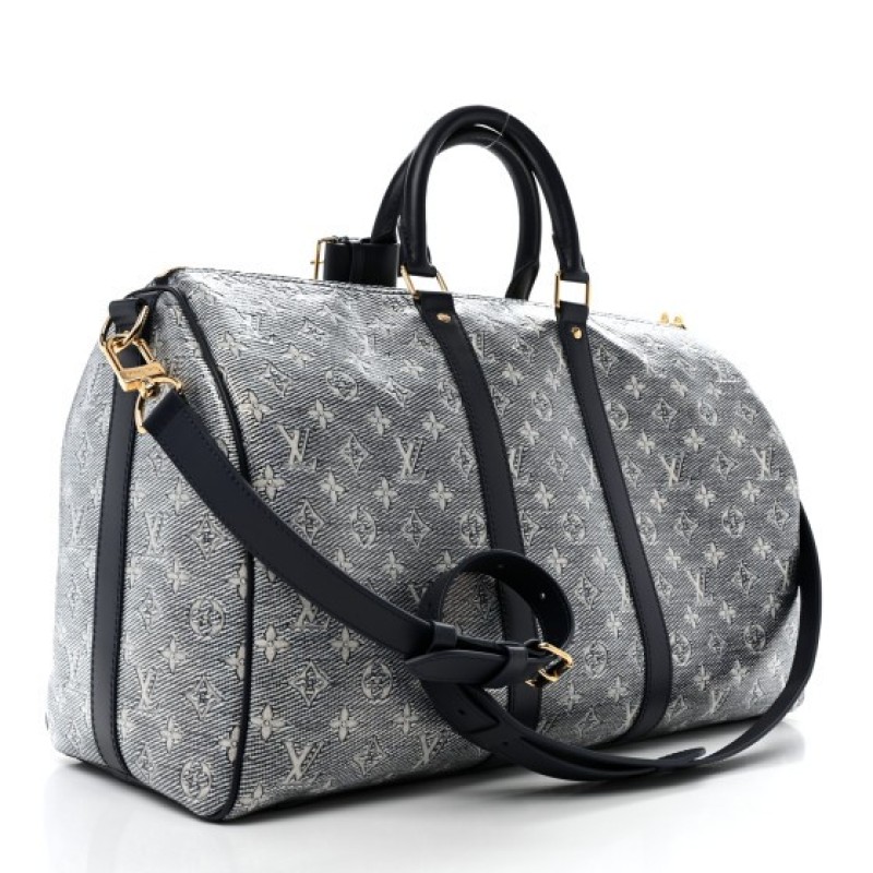 This is an authentic LOUIS VUITTON Monoglam Keepall 45 in Blue. This stylish tote is crafted from LV Monoglam jacquard canvas, which is woven from cotton and lurex, then laminated for a metallic shine. The luggage features rolled blue leather top handles, an optional shoulder strap, blue leather trim, and polished gold hardware. The top zipper opens to a blue fabric interior with a zipper pocket.