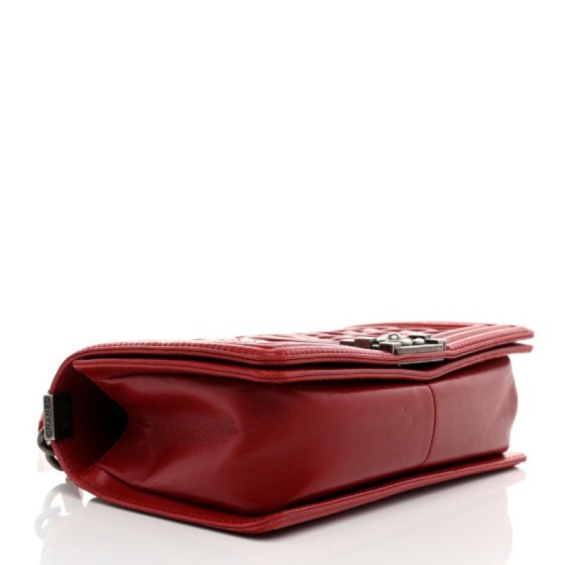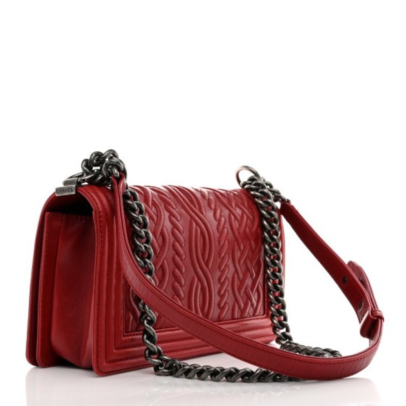 This is an authentic CHANEL Lambskin Medium Celtic Boy Flap in Red. This chic shoulder bag is crafted of a unique "Celtic" quilted lambskin leather with a border of bold linear quilting in red. The bag features a ruthenium chain link shoulder strap with a leather shoulder pad and a ruthenium Chanel CC boy push lock. This opens the front flap to a red fabric interior with a pocket.