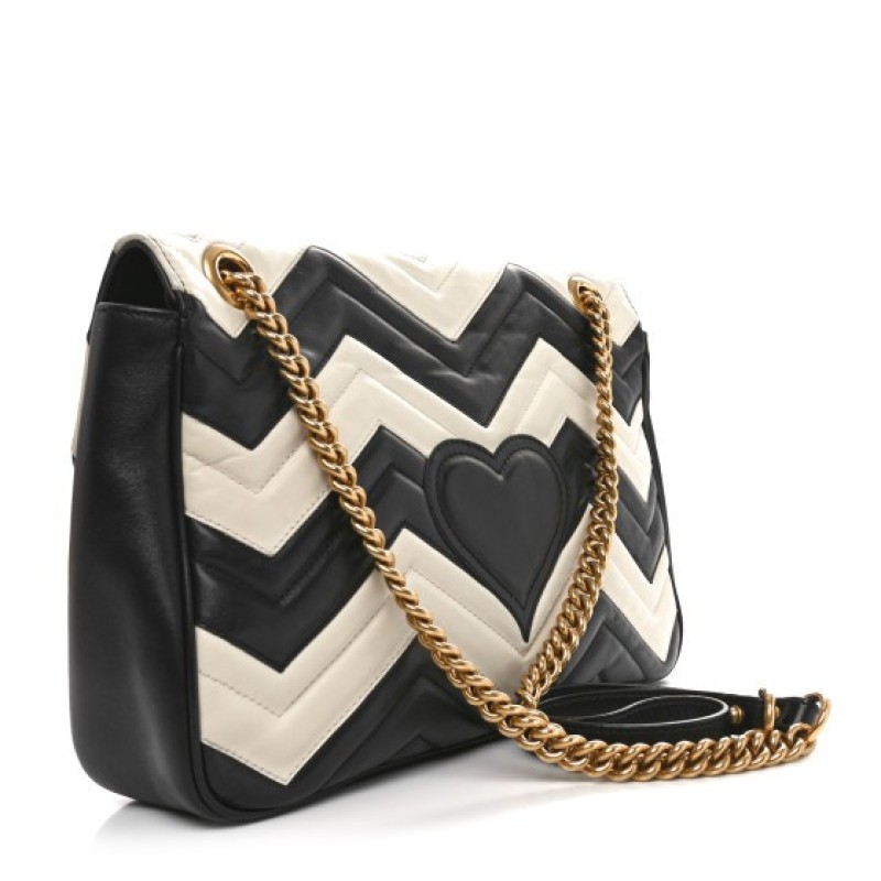 This is an authentic GUCCI Calfskin Matelasse Medium GG Marmont Shoulder Bag in Black and White. This chic bag is finely of soft calfskin leather in black and white with a beautifully stitched chevron pattern. This features aged gold chain shoulder strap with a black leather handle and interlocking GG logo closure. On the back of this beautifully crafted bag, there is a heart stitched into the chevron design. The front snap closure opens to a pink satin fabric interior with a zipper and patch pocket.