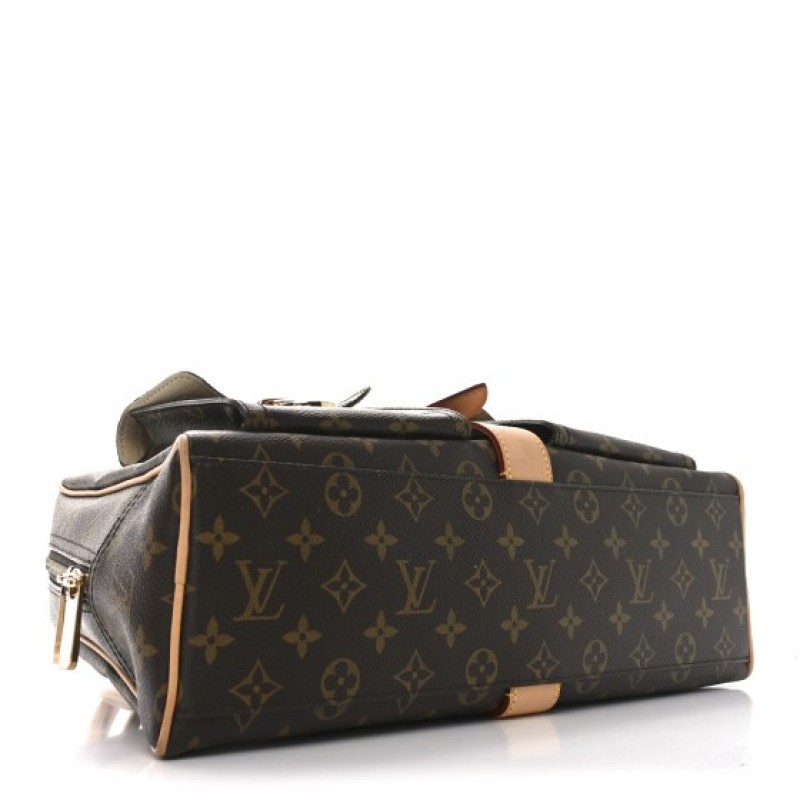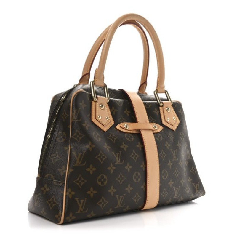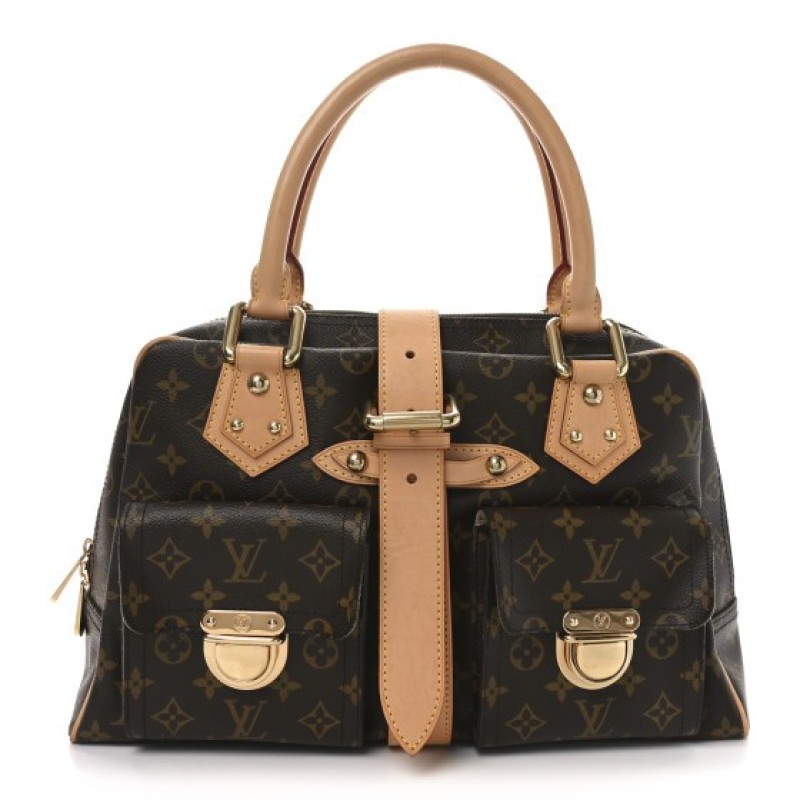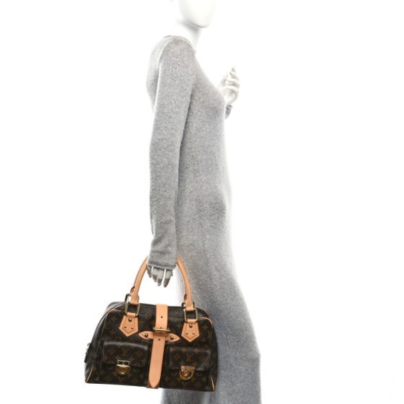 This is an authentic LOUIS VUITTON Monogram Manhattan GM. This chic tote is finely crafted of signature Louis Vuitton monogram coated canvas. This bag features vachetta cowhide rolled leather top handles and trim, two front flap pockets, and polished brass hardware. The wrap-around zippers open to a beige microfiber interior with a patch pocket.