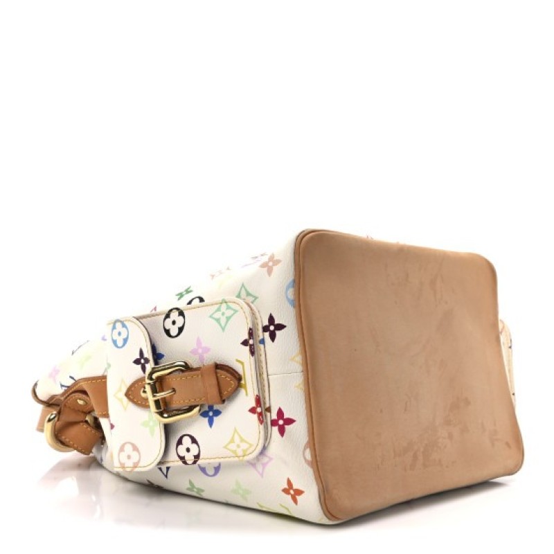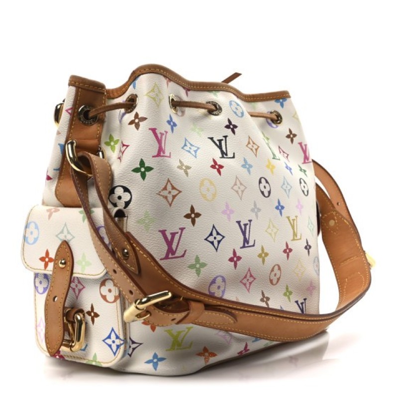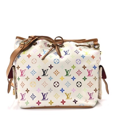 This is an authentic LOUIS VUITTON Monogram Multicolor Petit Noe in White. This shoulder bag is crafted a multicolored Louis Vuitton monogram in 33 vivid colors on white toile canvas. The bag features side buckle pockets, complemented with signature vachetta cowhide leather including the top cinch cord and an adjustable shoulder strap. The interior is a bright raspberry-red alcantara fabric with a patch pocket.