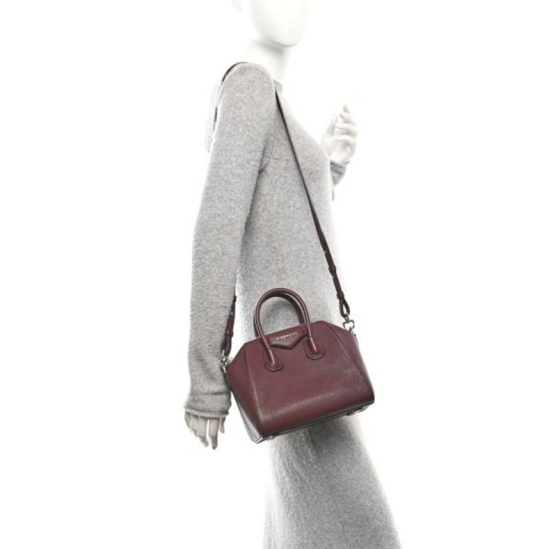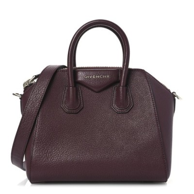 This is an authentic GIVENCHY Sugar Goatskin Mini Antigona in Oxblood. This bag is of grained goatskin leather in a rich shade of burgundy. It features rolled top handles, a leather shoulder strap, and polished silver hardware. The top zipper opens to a beige fabric interior with zipper and patch pockets.