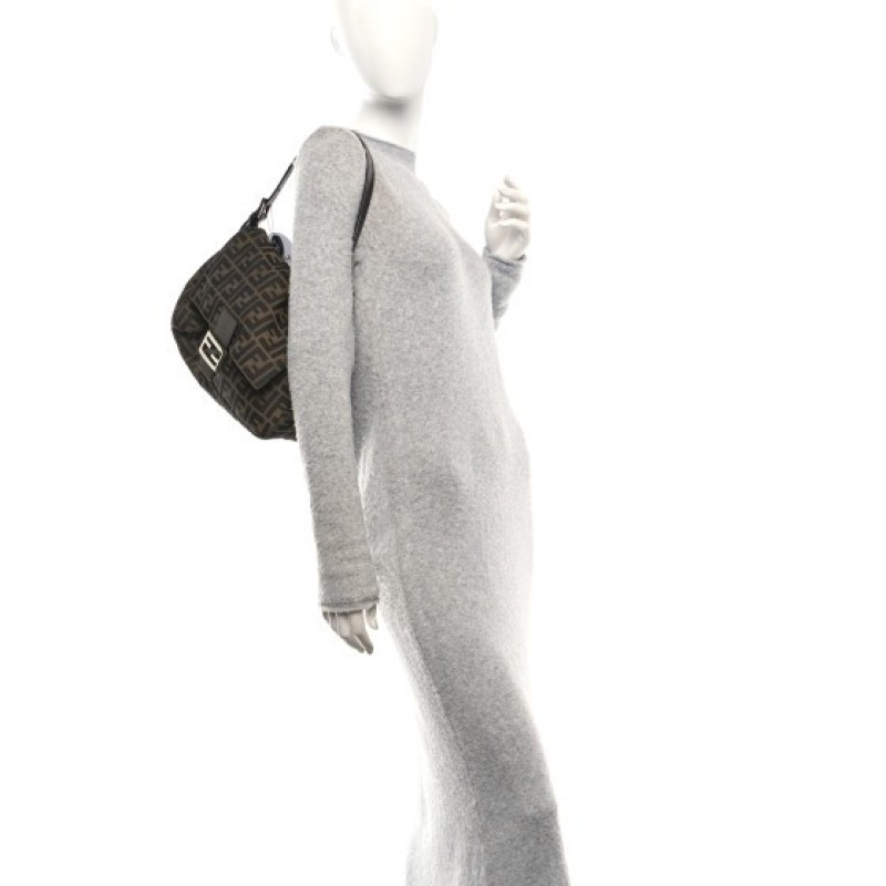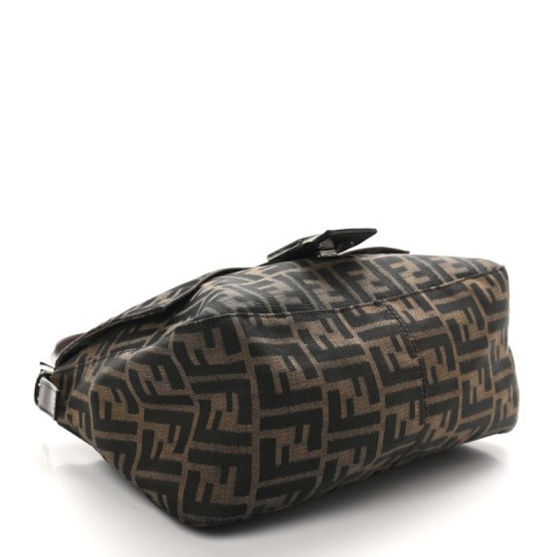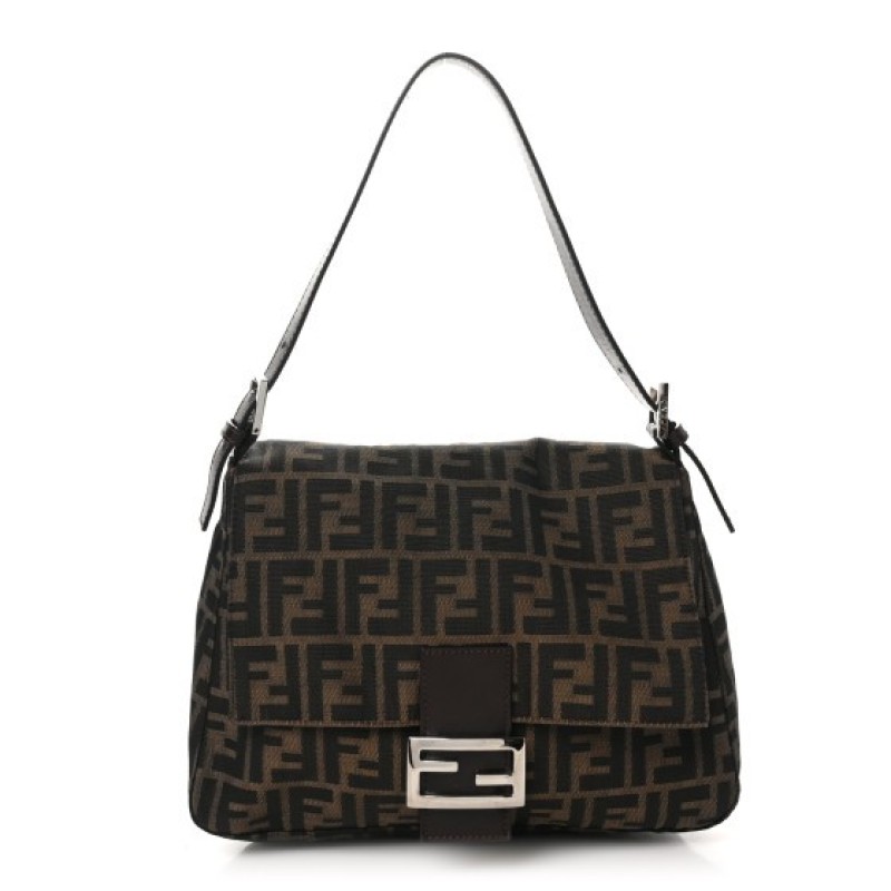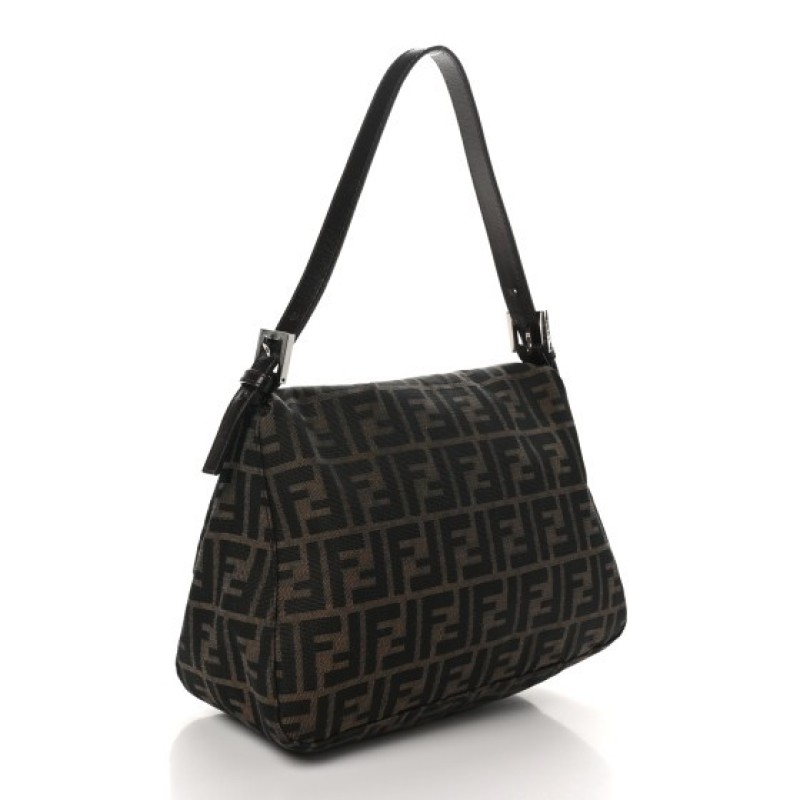 This is an authentic FENDI Zucca Mama Baguette in Tobacco. This classic Baguette is crafted of FF Zucca canvas in brown. It features an overhanging flap, an adjustable brown leather shoulder strap, and a prominent polished silver Fendi FF closure snap. This opens to a brown fabric interior with a zipper pocket.