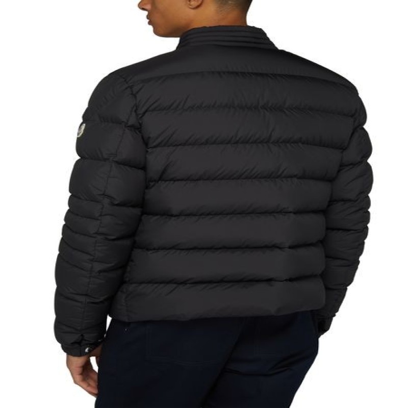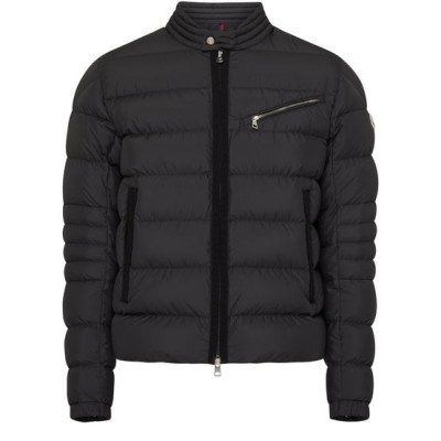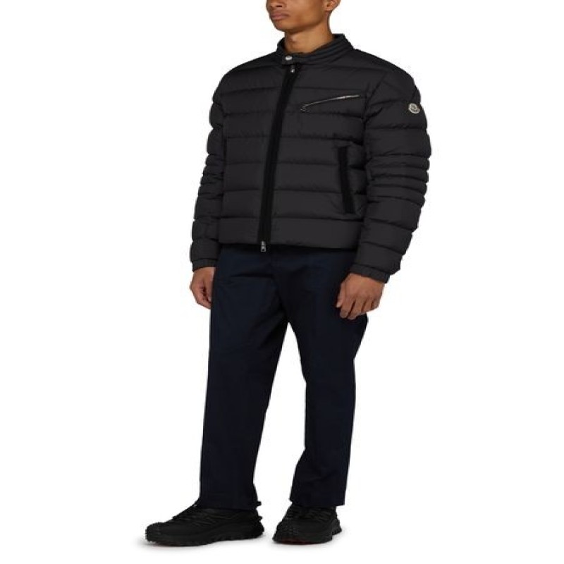 Moncler's Souillet puffer jacket showcases a short, high neck silhouette with long-sleeved design and convenient zipper closure. Inspired by biker jackets, it combines style and functionality seamlessly. With side pockets for essentials and a striking silver finish, this jacket is perfect for those seeking warmth and sophistication in colder climates.