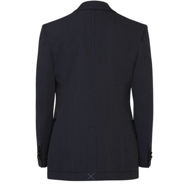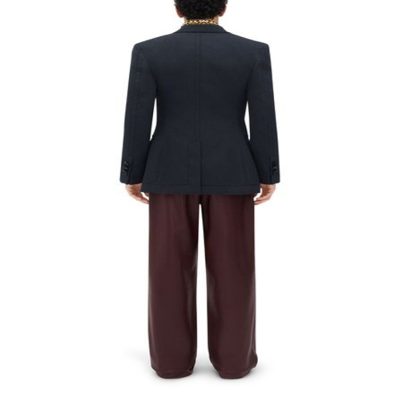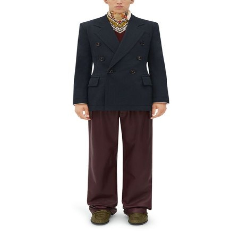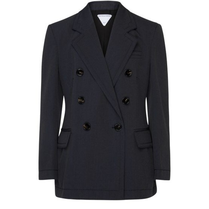 This long-sleeved Bottega Veneta woolen serge jacket features a double-breasted style with a 3-button closure. It has a logo at the back label and a notched collar. The jacket also includes flap pockets, a breast pocket, and two front pockets with welt pockets for added functionality and style.