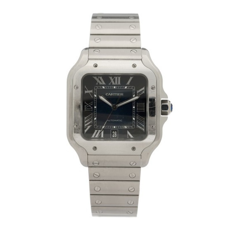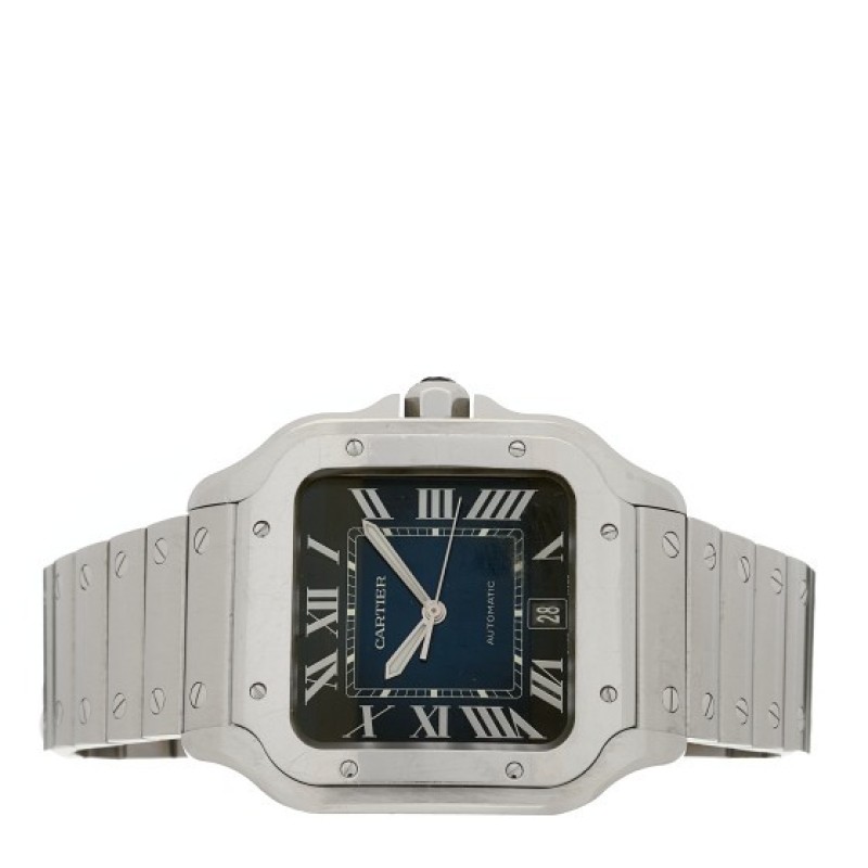 This is an authentic CARTIER Stainless Steel 39.8mm Santos De Cartier Automatic Watch Blue. This watch is crafted of stainless steel and features a blue dial, Roman numeral hour markers, luminescent sword hands, sapphire crystal, and an automatic movement.