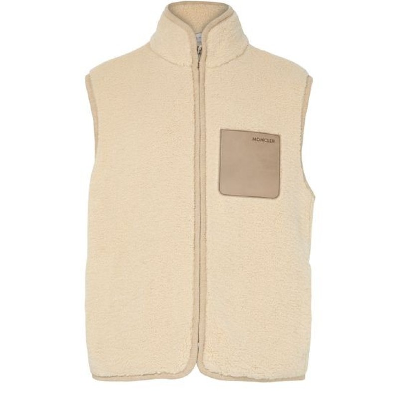 Introducing Moncler's zipped-up sleeveless jacket, a sleeveless marvel crafted from warm fabric. This short, high-neck piece features a zipper closure and a front logo, complemented by a breast pocket and topstitched edges. Its padded texture and lined interior make it a versatile choice for any casual outing.