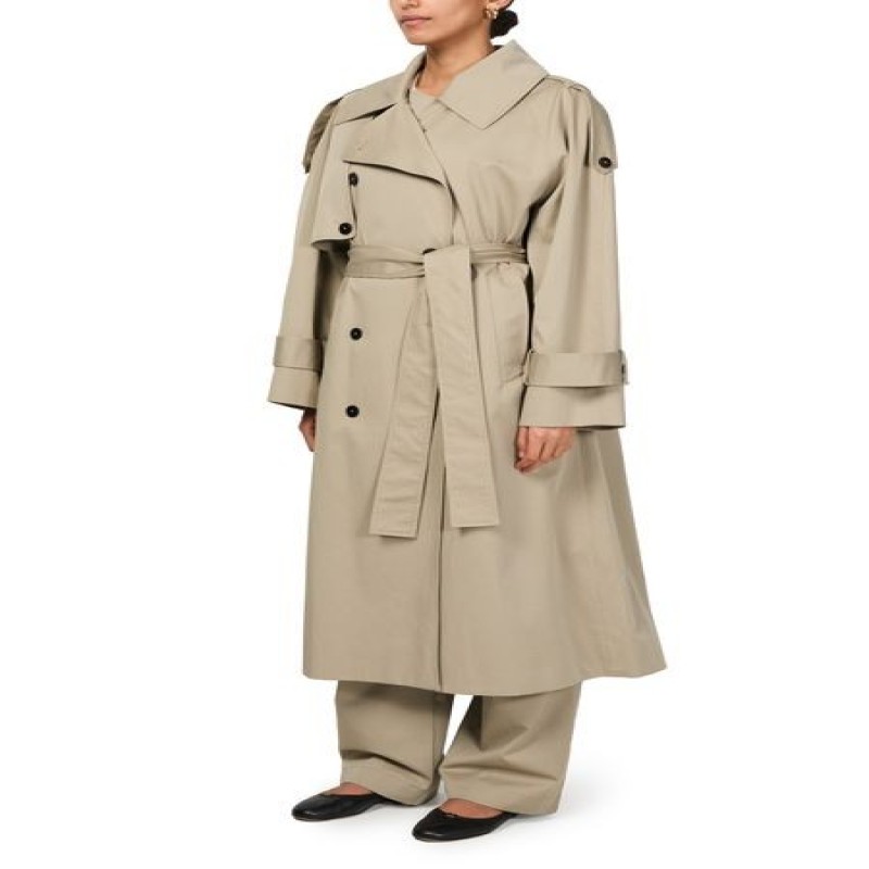 Skall Studio's Mahsa trenchcoat redefines oversized elegance with its long, flowing silhouette. Featuring embellished buttons and a collar neckline, this piece adds flair to any outfit. Practical flap pockets and a double-breasted button fastening enhance its functional style, perfect for versatile wear throughout various occasions.
