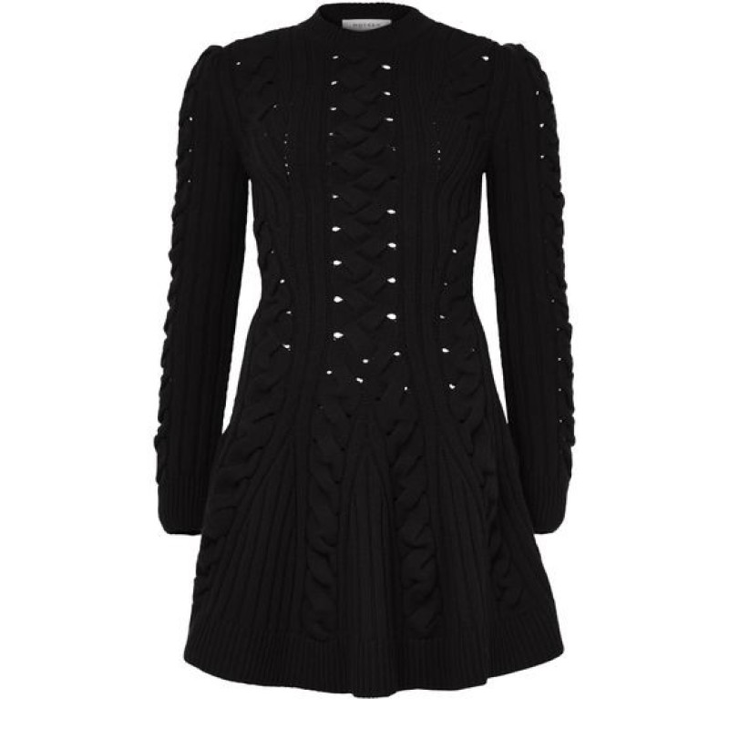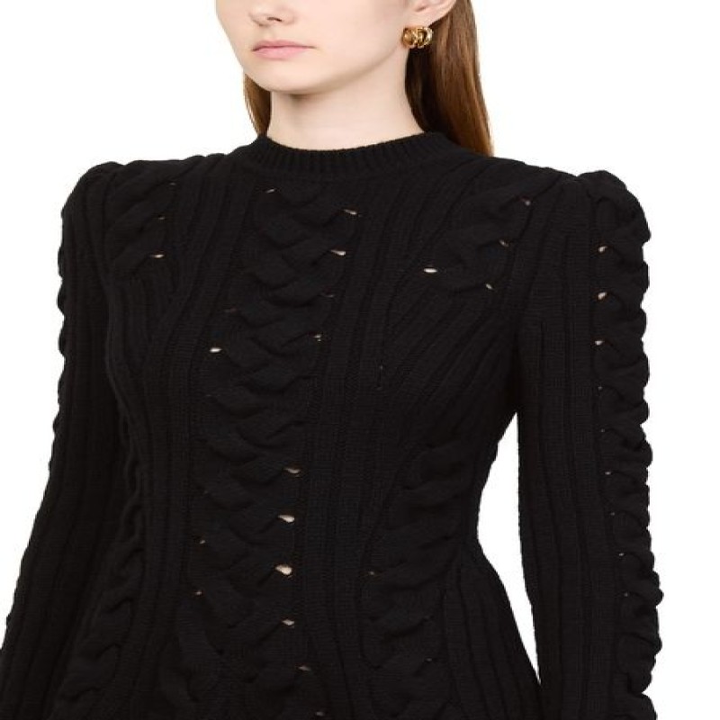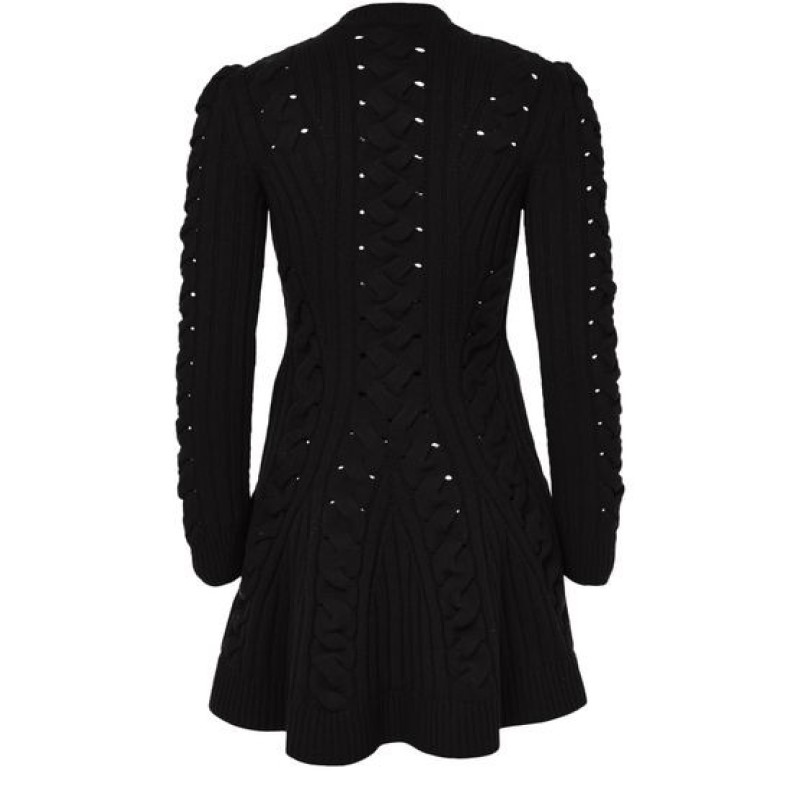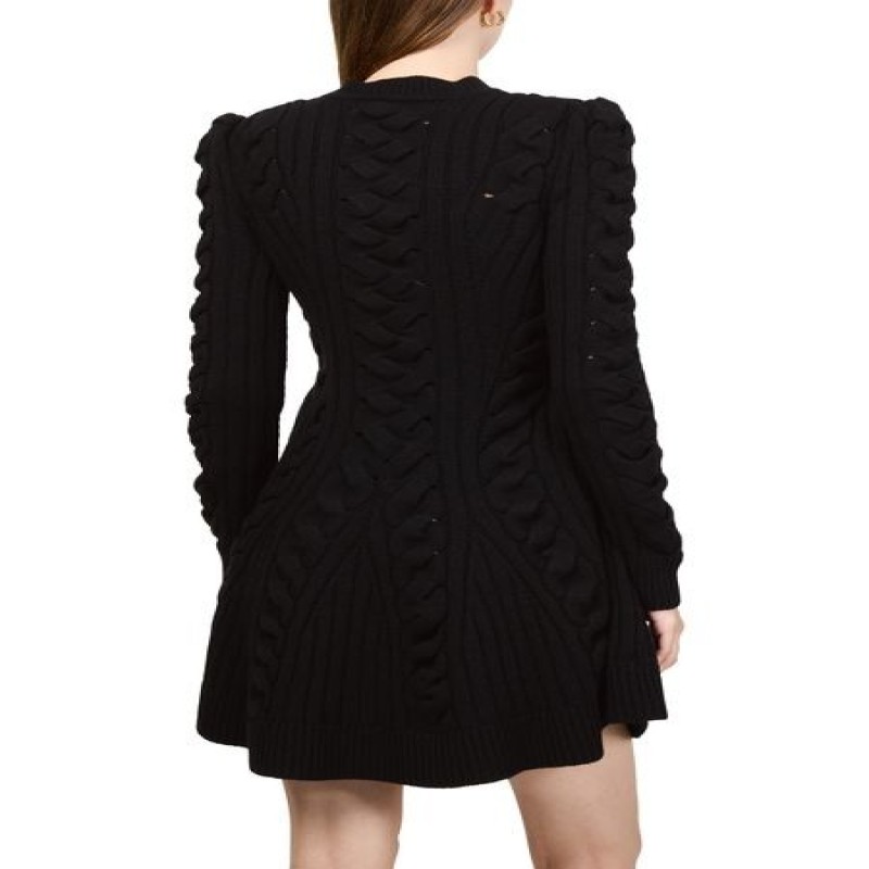 Introducing Alexander McQueen's mini cable knit dress, a masterpiece of modern elegance. This slim fit dress features a round neck and long puff sleeves, crafted from ribbed material for a textured finish. Perfect for any occasion, its mini length adds a playful touch to your wardrobe.
