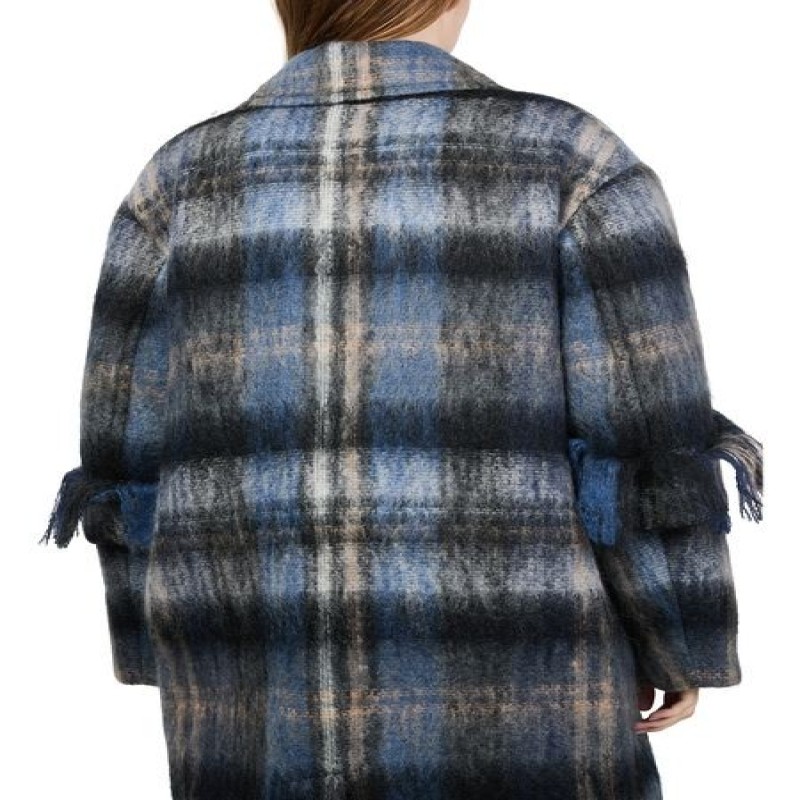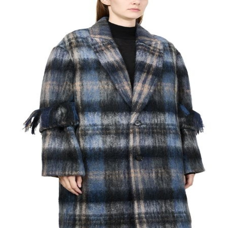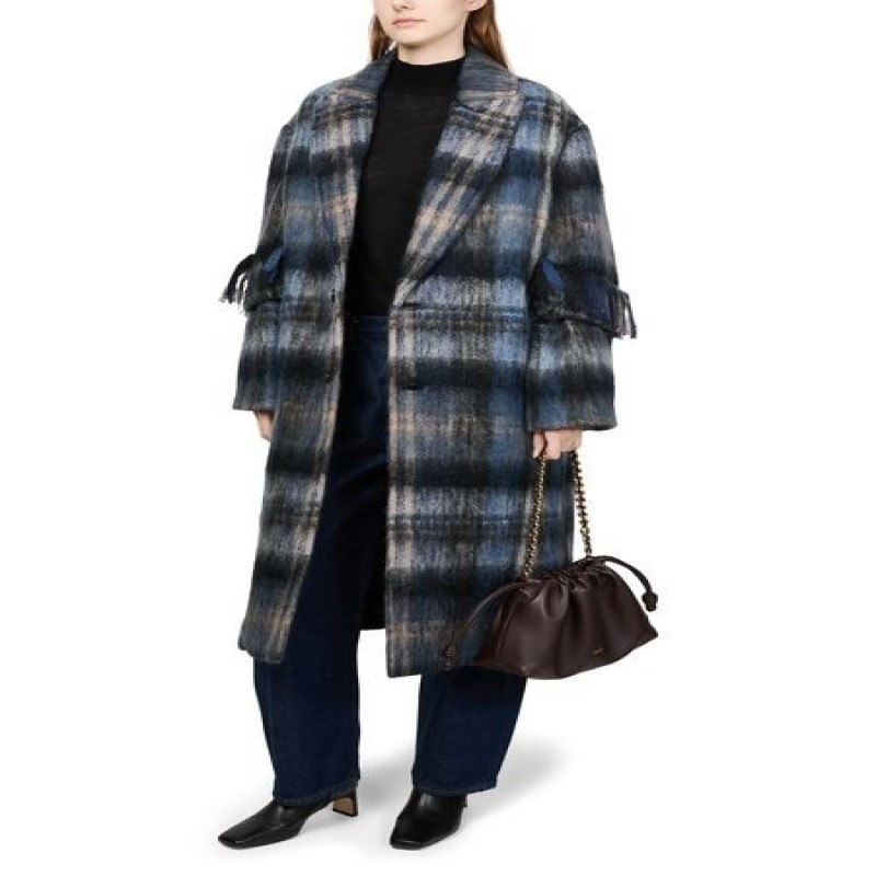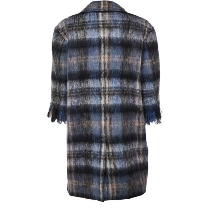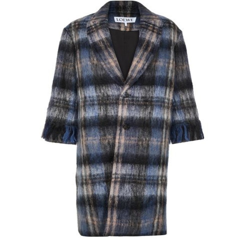 Introducing Loewe's striped coat, a masterpiece of modern elegance. Crafted from warm fabric, this long, double-breasted coat features a checked pattern and fringe details. The classic overcoat design is enhanced by flap pockets and a collar, making it a versatile addition to any wardrobe.