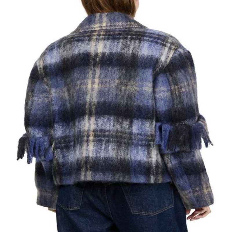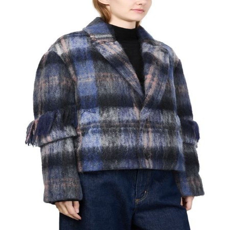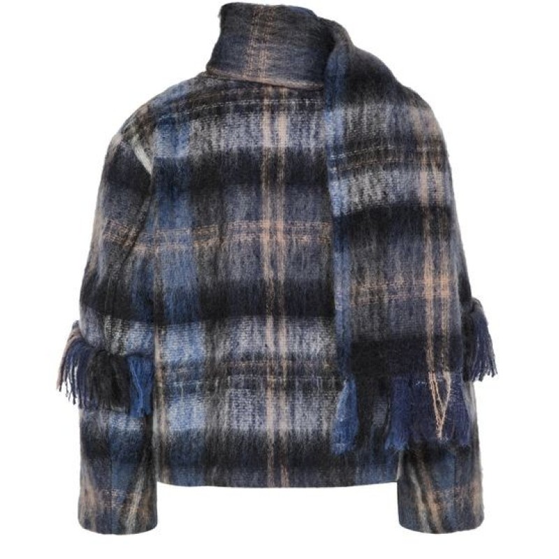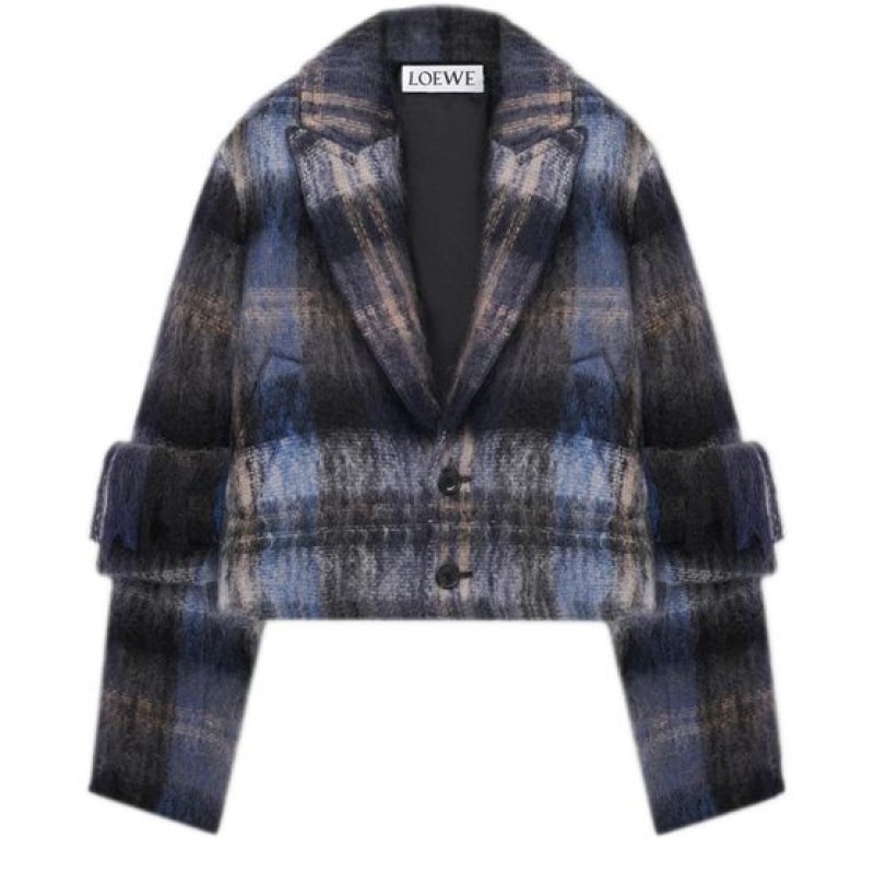Introducing Loewe's jacket in mohair and wool blend, a chic addition to your wardrobe. This short, long-sleeved piece features a checked pattern and fringe details, offering a modern twist on classic style. Crafted from warm fabric, it boasts a 2-button closure and practical patch pockets, perfect for versatile styling.