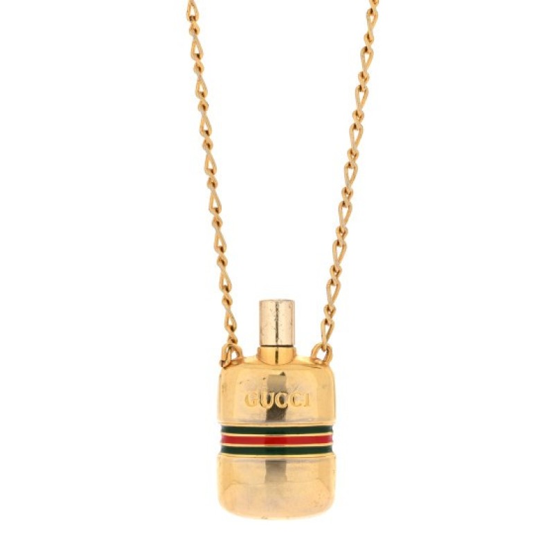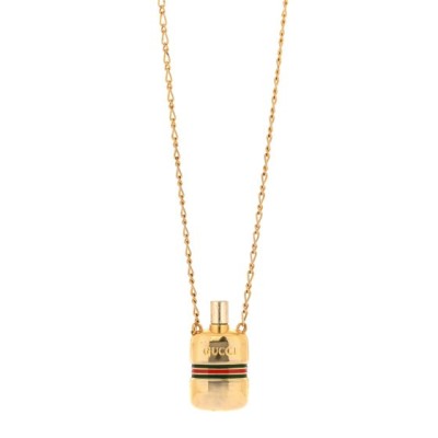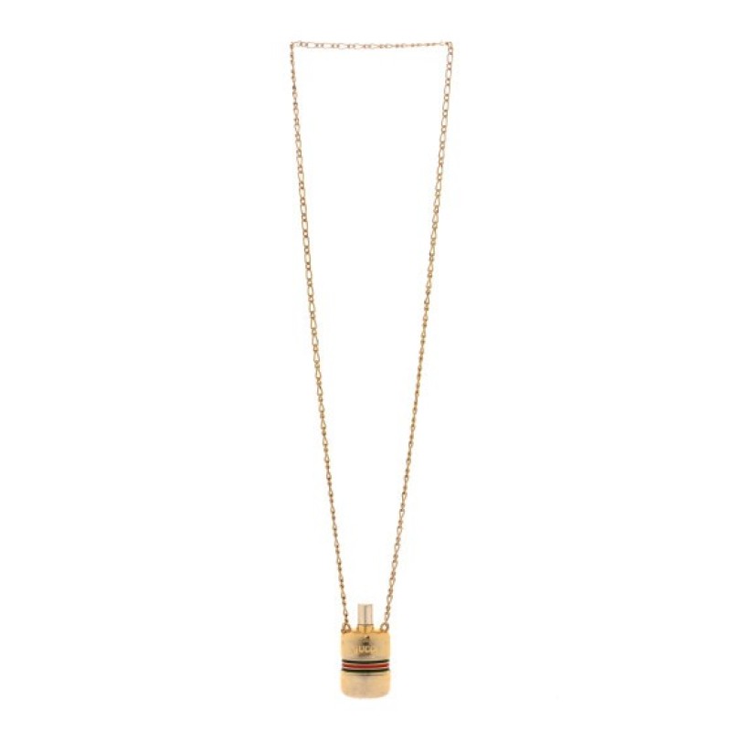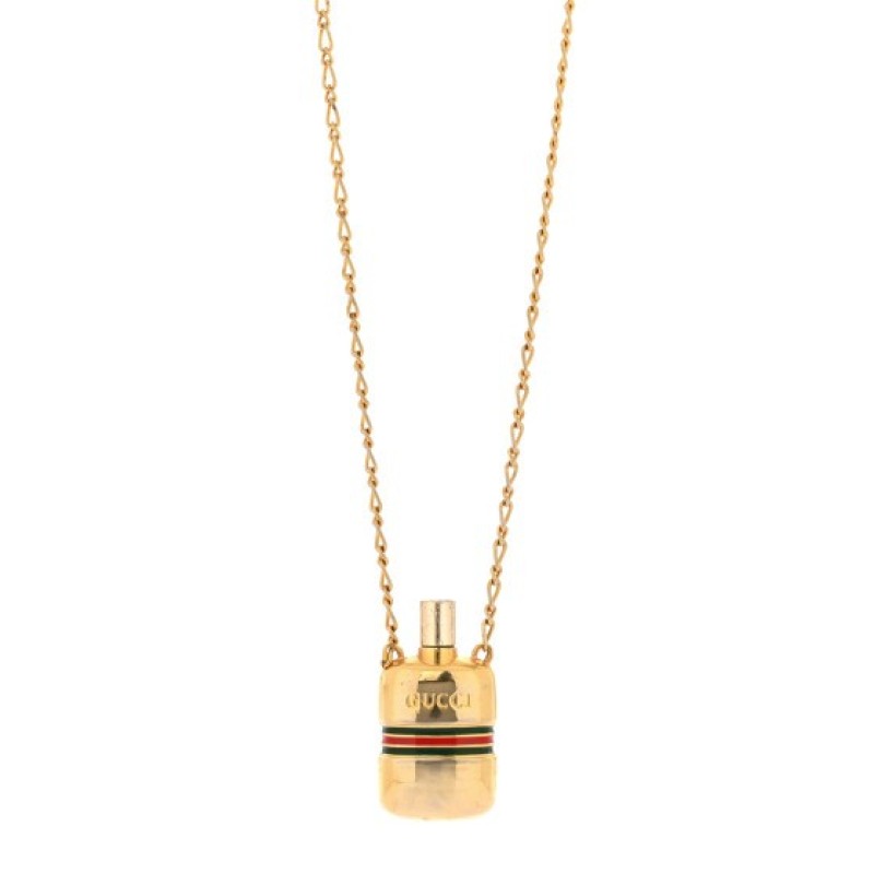 This is an authentic GUCCI Metal Enamel Bottle Pendant Necklace in Gold. This necklace is crafted in an aged gold tone and features a hollow pendant that opens with red and green stripes across the middle.