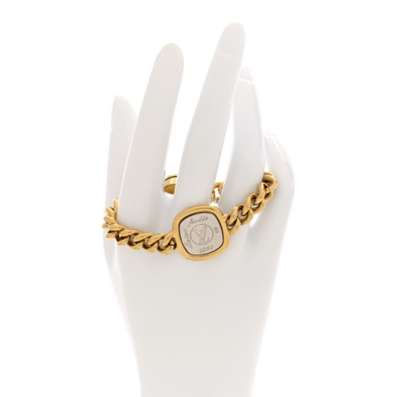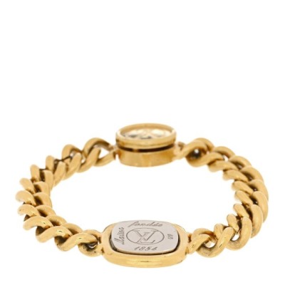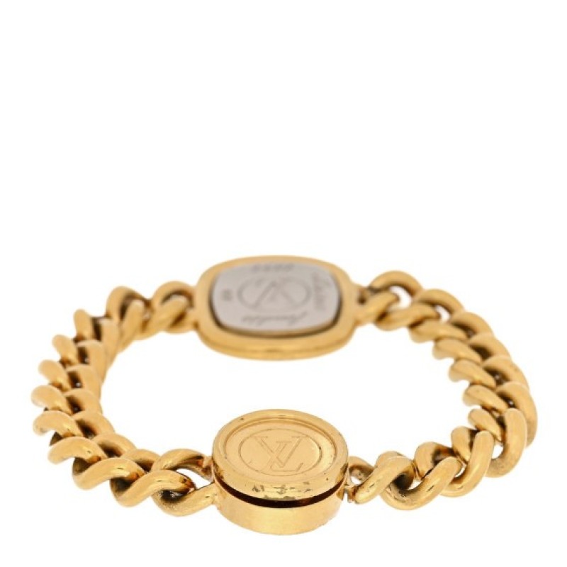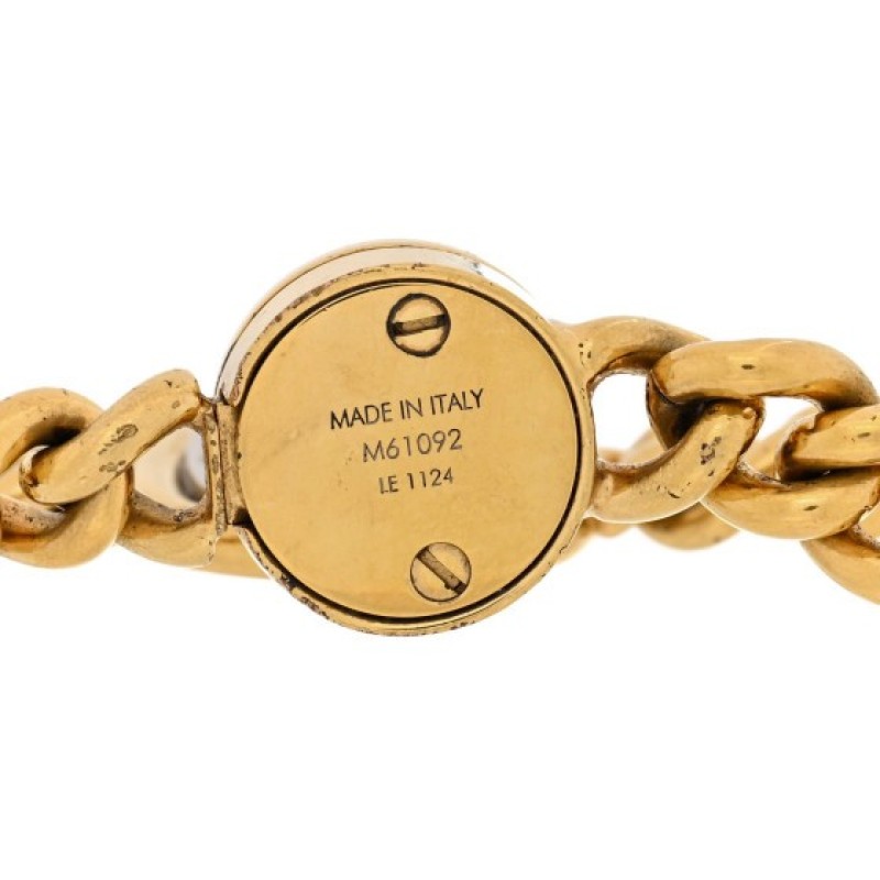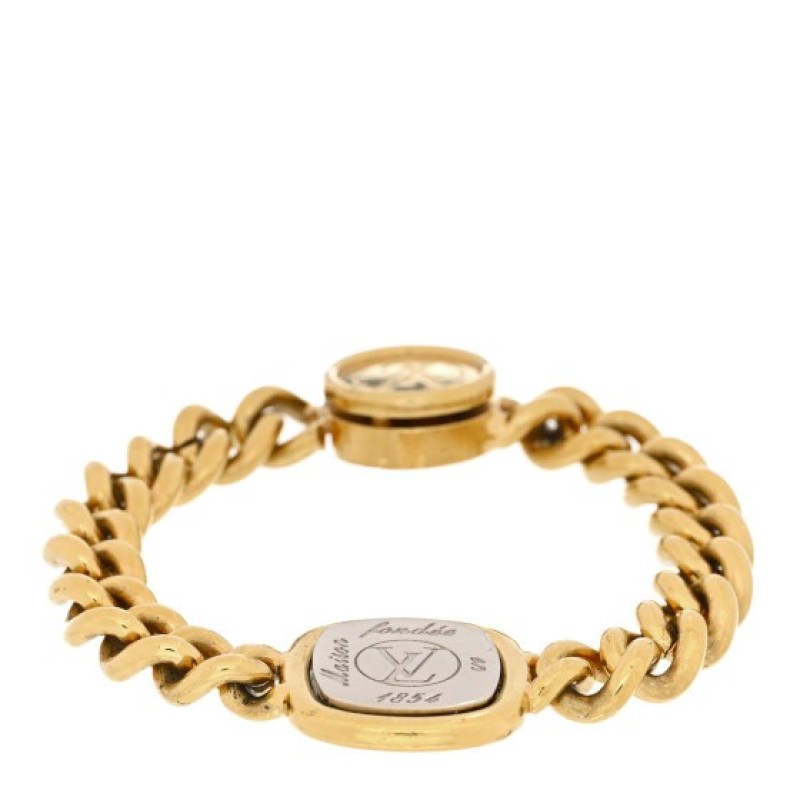 This is an authentic LOUIS VUITTON Chain ID Bracelet in Gold. This unique bracelet has a large linked gold chain with a gold and silver LV logo charm. This is a unique bracelet with the luxury and style of Louis Vuitton!