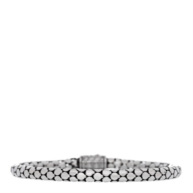 This is an authentic JOHN HARDY Sterling Silver 18K Yellow Gold 6mm Dot Bracelet. The bracelet is crafted of sterling silver and 18 karat yellow gold and features a flexible band with the signature dot motif and a push clasp. PLEASE NOTE: One dot near the clasp is bent.