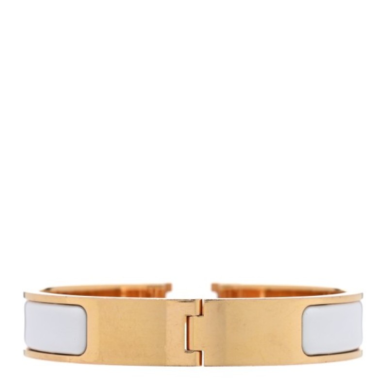 This is an authentic HERMES Enamel Narrow Clic Clac H Bracelet PM in White. This gold-toned bracelet features a white enamel inlay and an "H" swivel closure.