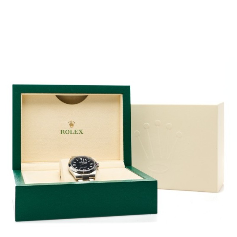 This is an authentic ROLEX Stainless Steel 40mm Oyster Perpetual Explorer Watch Black 224270. This watch is crafted of stainless steel and features a black dial with luminescent hour markers and hands, sapphire crystal, and an automatic movement.